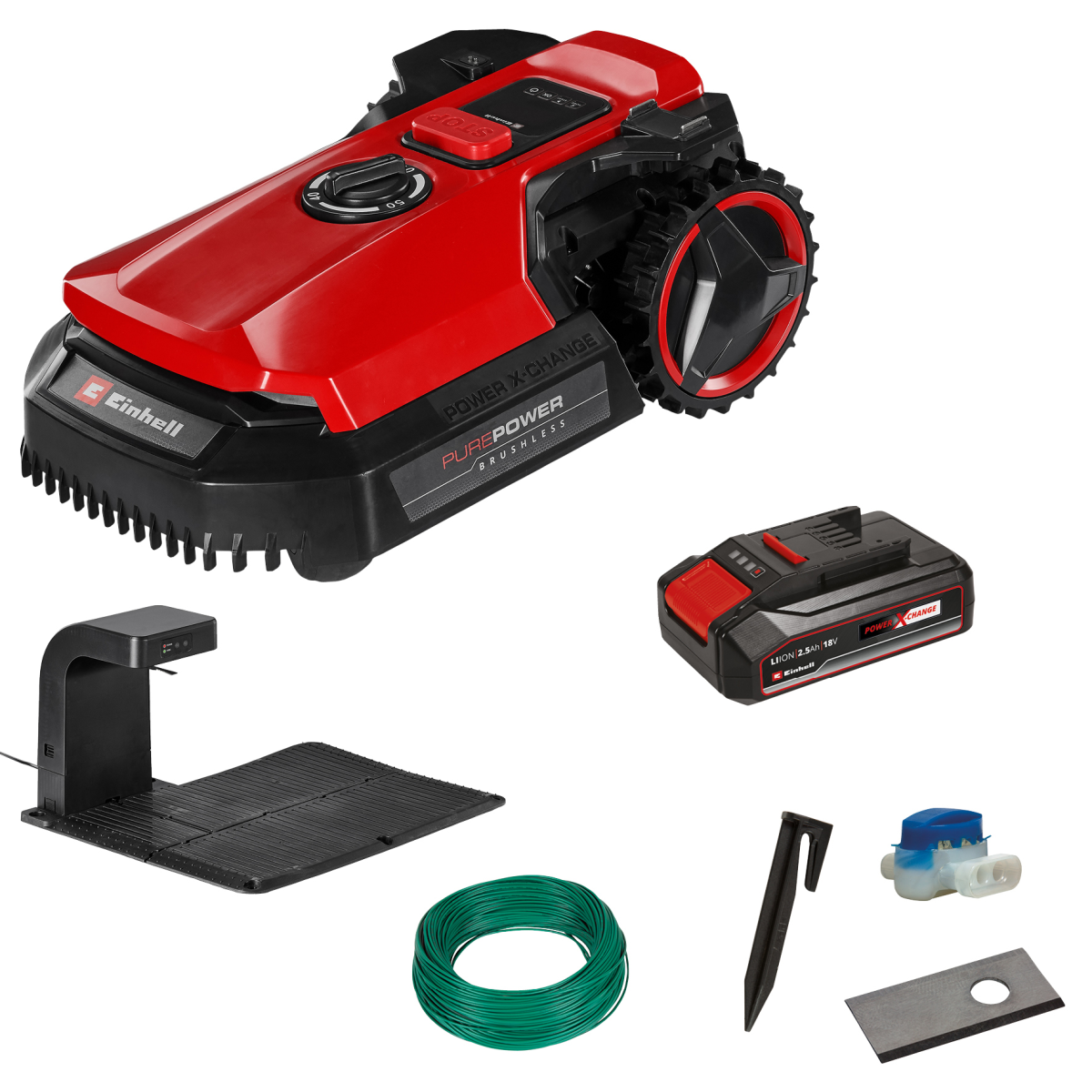 A gyártó a robotfűnyíróhoz teljes telepítőkészletet mellékel: 190 rögzítőcsap, 130 méter határolóhuzal, 3 tartalék penge, 2,5 Ah Power X-Change Plus akkumulátor és töltőállomás is a csomag része.