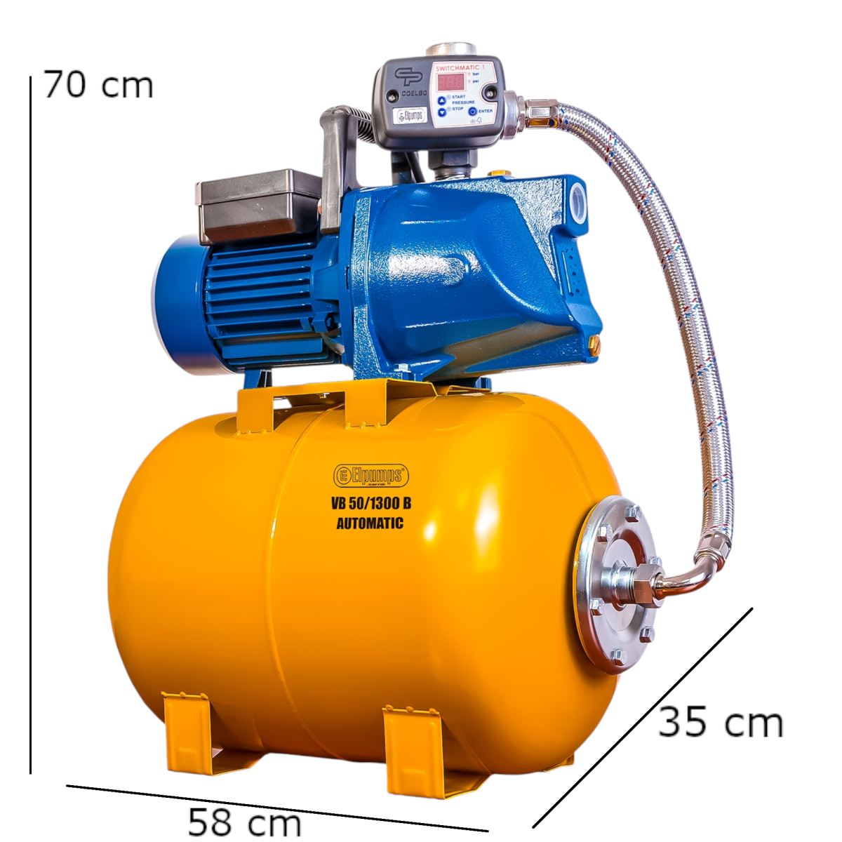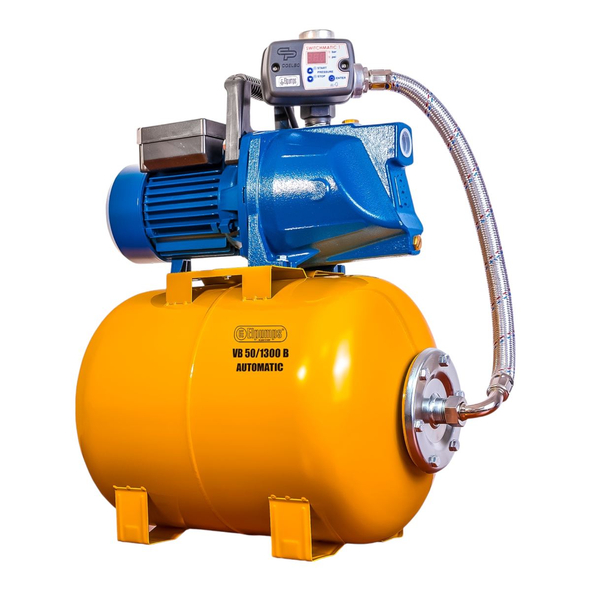 Az Elpumps VB50/1300B Automatic házi vízmű megbízható megoldás családi házak komplett vízellátására, vagy akár kertek öntözésére is. Az automatikus vezérlésű rendszer 1300 W-os motorral és 47 méteres emelőmagassággal működik, így alkalmas fúrt vagy ásott kutakból történő vízkiemelésre. A percenként akár 90 literes szállítási teljesítmény biztosítja a folyamatos vízellátást több felhasználási ponton is.