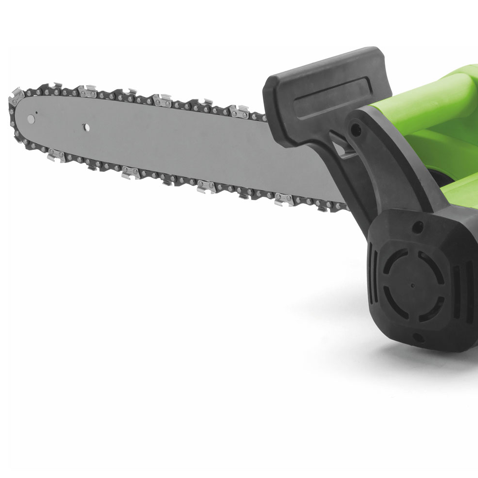 2000 W-os elektromos láncfűrész, 120 ml-es olajtartály kapacitással, automata olajpumpával, biztonsági láncfékkel, lánctartóval.