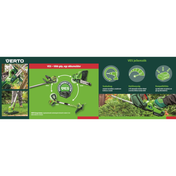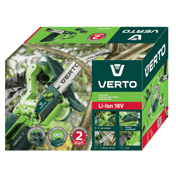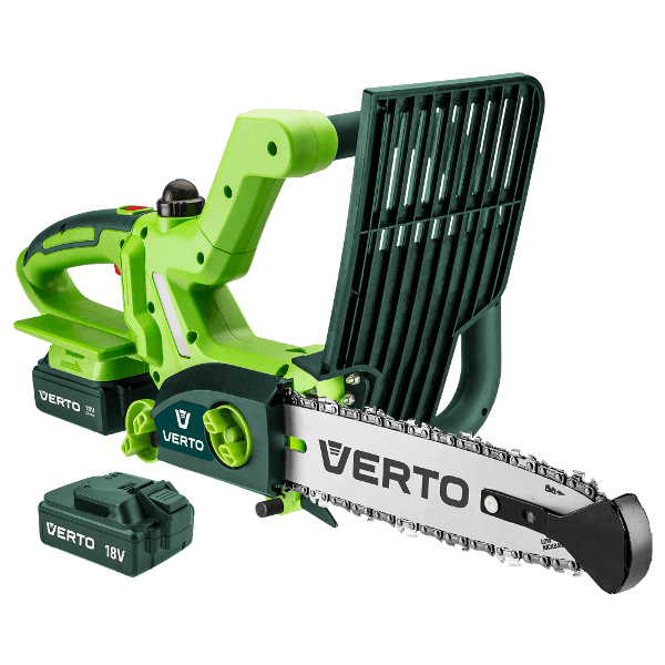 VERTO 18V feszültségű akkumulátoros láncfűrész, 12" vezetősínnel, rendkívül jól használható a ház körüli és kerti munkákhoz. Biztonsági fékkel rendelkezik, amely védi használóját a vágás során visszacsapódó forgácsoktól, portól és megakadályozza a véletlenszerű bekapcsolódást. A fűrészgép kézi fűrészlánc kenő rendszerrel és olajszint mutatóval rendelkezik. Nincs szükség csatlakozóaljzatba csatlakoztatni, ami határozottan megnöveli a munkavégzés komfortját. Az európai biztonsági standardoknak való megfelelőséget a CE tanúsítvány biztosítja. A VERTO márka elektromos szerszámokat és tartozékokat kínál minden ezermester számára. 2 db Li-ion-os (18V) akkumulátorral; lánc futási sebesség: 3,73m/s; vezetőrúd hossza: 210mm; max. vágási mélység: 130mm; lánc skála: 0,375.