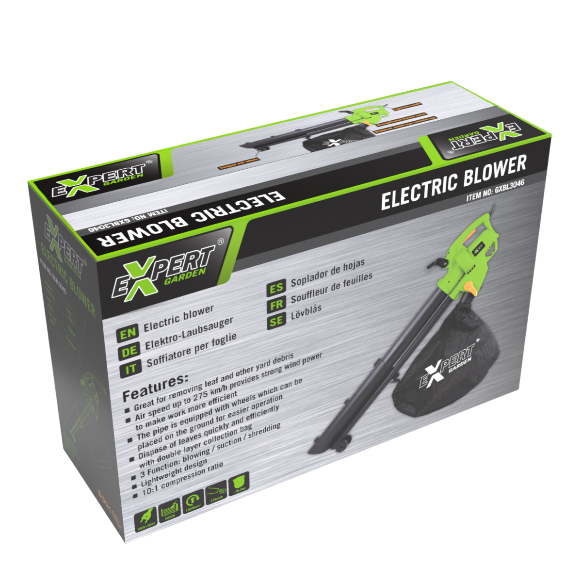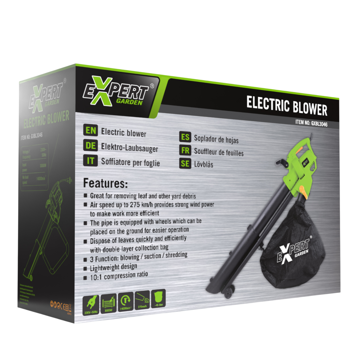 Az Expert GXBL3046 elektromos lombszívó ideális társ a kert gyors és hatékony tisztán tartásához. Három funkciót egyesít: fújás, felszívás és aprítás. A 3000 W teljesítményű készülék nagy levegősebessége (275 km/h) és 45 literes gyűjtőzsákja lehetővé teszi a száraz levelek, apró ágak, papír vagy faforgács gyors eltávolítását és részleges tömörítését. A szívómód használatakor a felszívott zöldhulladék aprítás után kerül a gyűjtőzsákba, így csökkentve a térfogatát – a keletkező anyag akár talajtakaróként is hasznosítható növényeid köré.