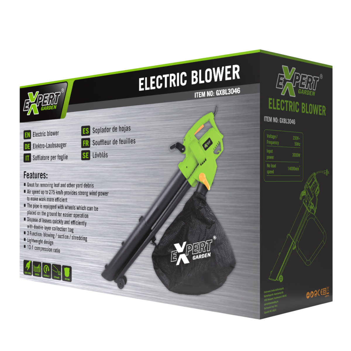 Expert elektromos lombszívó 3000W 45 l gyűjtőzsákkal – 3 az 1-ben megoldás kertedhez