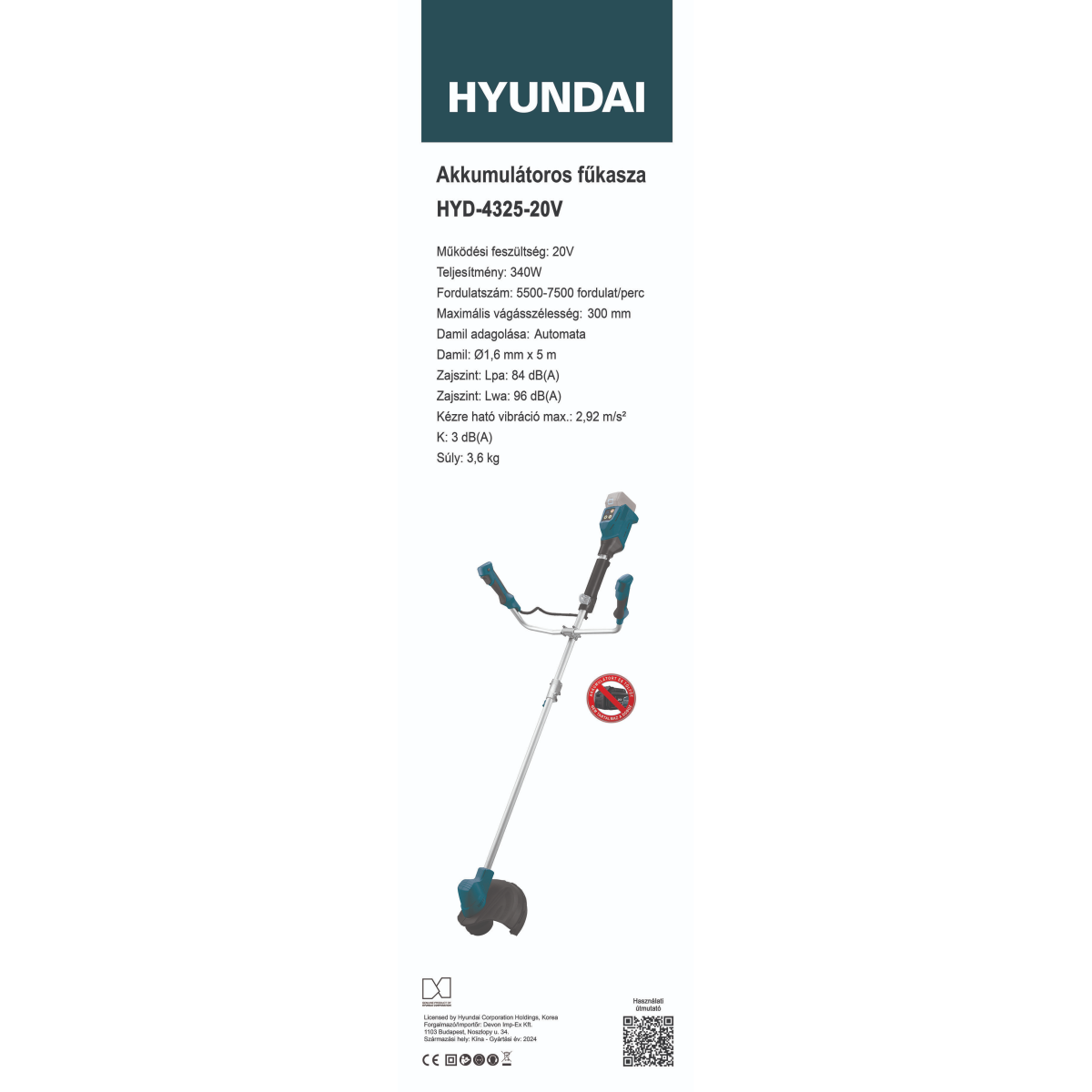 A HYUNDAI akkus fűkasza HYD-4325-20V egy erőteljes, akkumulátoros fűnyíró, amely ideális a gyepszegélyek precíz nyírásához és a kisebb bozótok eltávolításához. Ez a modell 340W teljesítményű és 30 cm vágási szélességet biztosít, ami lehetővé teszi a hatékony munkavégzést. Az akkumulátor nélküli kivitelnek köszönhetően, a készülék kompatibilis más, ugyanazon a platformon működő 20V-os akkumulátorokkal, így rugalmasan használható különböző kerti feladatokhoz.