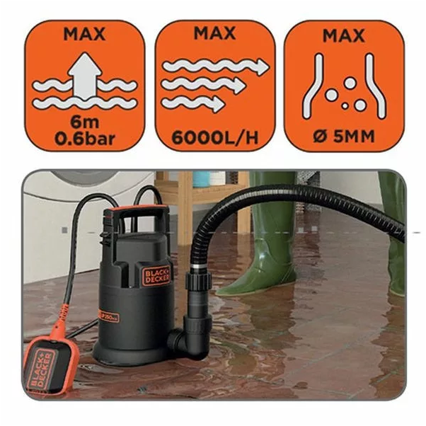 Black&Decker BXUP250PCE búvárszivattyú tiszta vízhez. A merülő szivattyú ideális elöntött pincék, garázsok, illetve tartályok kiszivattyúzásához. A beépített úszókapcsoló automatikusan be- és kikapcsolja a szivattyút. Ütésálló műanyag ház. Automatikus leállítás úszókapcsolóval.