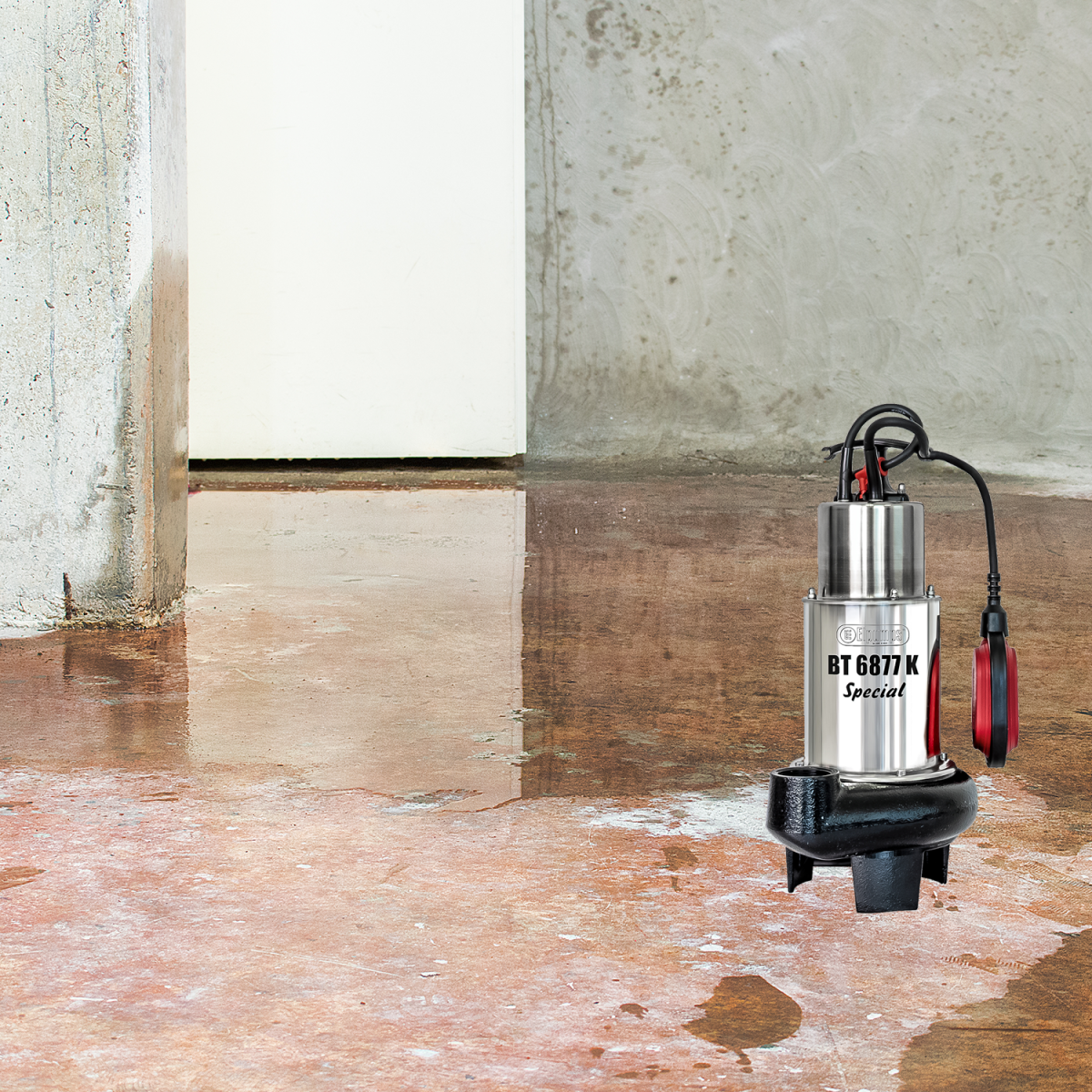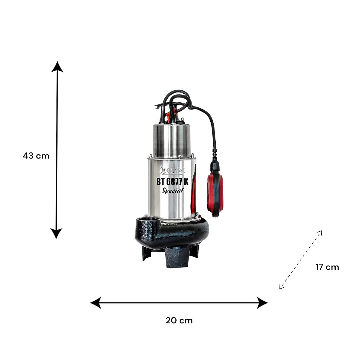 BT 6877 K special darabolós szennyvíz szivattyú, inox kivitel; családi házak szennyvíz aknáinak kiszivattyúzására; vas öntvény szivattyú ház és lapátkerék; csatlakozás: 6/4". A szivattyú részét képezi egy aprító egység, amely a vízben található aprítható és puha részek szétdarabolásához, valamint ezeknek a vízzel együtt való továbbításához szükséges.