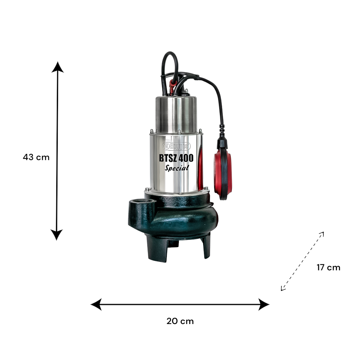 A BTSZ400 special szennyvíz szivattyú inox motorházzal rendelkezik; vas öntvény szivattyú házzal és lapátkerékkel; csatlakozás: 1 1/2" .