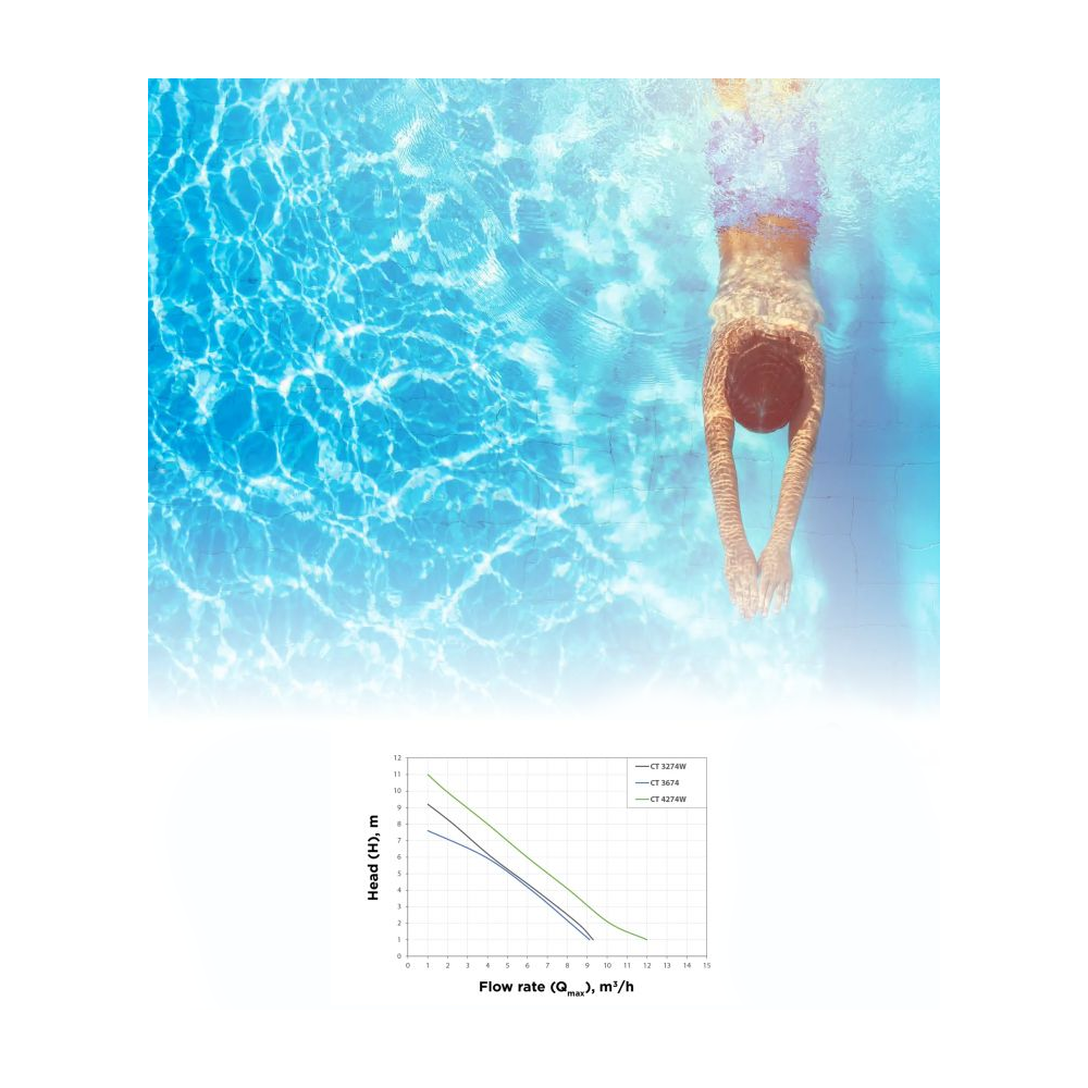CT 3674 talpig szívó merülő szivattyú. Az Elpumps merülő szivattyúi kiválóan alkalmasak tiszta víz szivattyúzására, legyen szó akár pincék, aknák, kerti medencék kiszivattyúzásáról. Csatlakozás 1 1/4; motor, tengely inox anyagból, lapátkerék műanyagból (PPO) készül; 5 mm-ig történő leszívás.