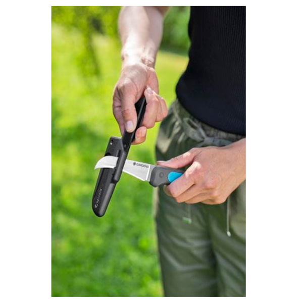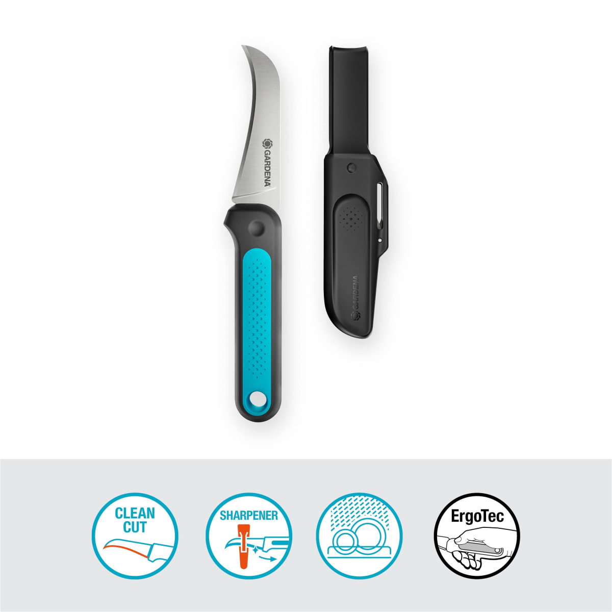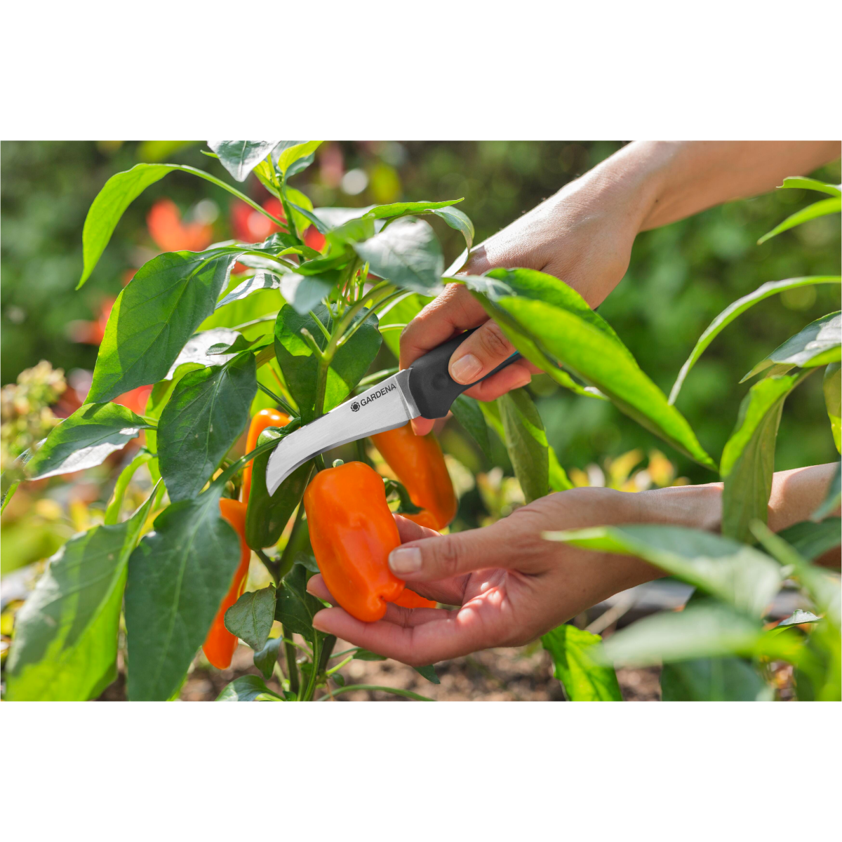 Szüretelő kés tokkal és a mellékelt élezővel. Használd a GARDENA praktikus VeggieCut termékét zöldségek és saláták betakarításához, tisztításához és hámozásához. A sarló alakú kés tartós rozsdamentes acélból készült. Lehetővé teszi a pontos, tiszta és könnyű vágásokat. A vastagabb zöldségeket, például cukkinit is vághatsz egyetlen mozdulattal. A mellékelt tok többféleképpen is segít. A német fejlesztésű kés a tokban mindig kéznél van szüreteléskor, és biztonságosan tárolható. Ha szükséges, használd a beépített élezőt. A kés ergonomikus ErgoTec markolata kényelmesen illeszkedik a kézbe, és a beépített puha alkatrészeknek köszönhetően csúszásmentes. Az élelmiszerbiztos VeggieCut nem bocsát ki semmilyen illatot vagy ízt. Ideálisan tárolható a konyhai falra akasztva, például, a fűzőlyuk használatával. A szüretelő kés nagyon könnyen tisztán tartható, mert mosogatógépben is mosható.