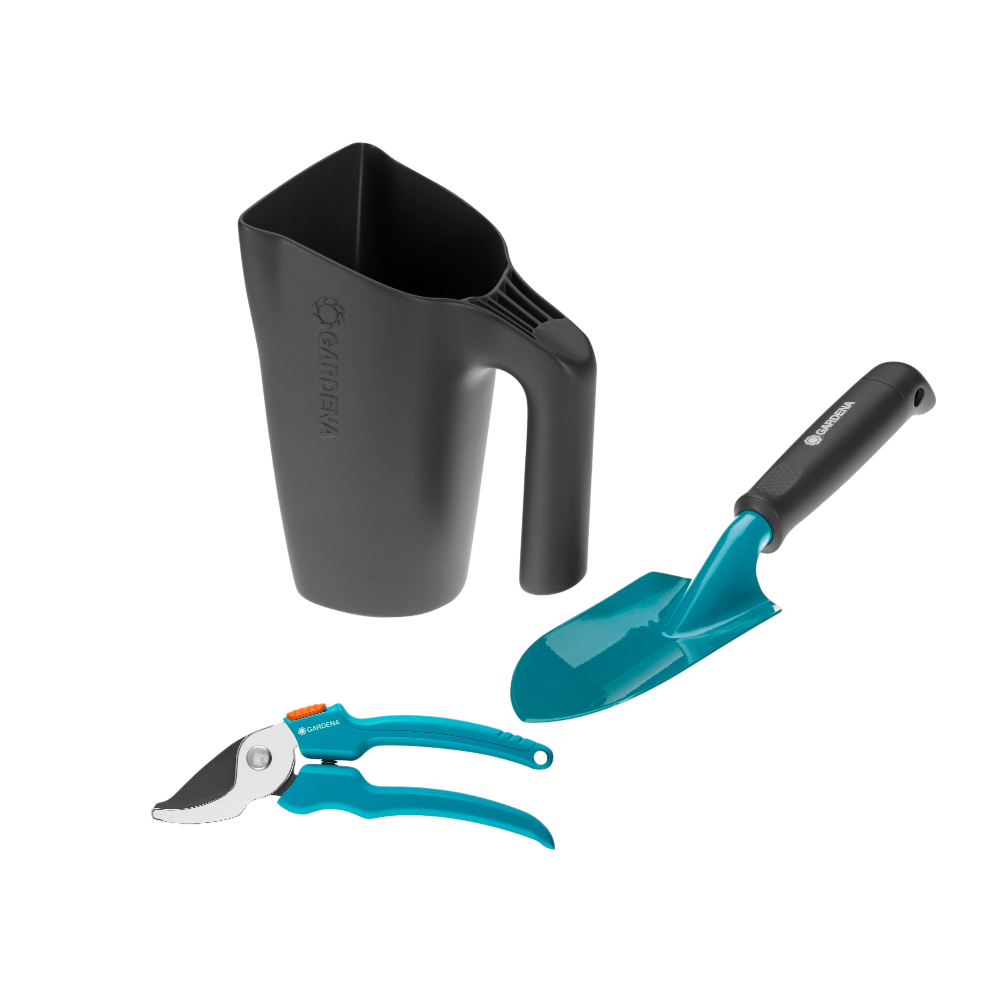 Praktikus készlet többfunkciós kannával hobbikertészeknek. Ez a készlet tökéletes belépő a GARDENA kerti szerszámok világába. Tartalmaz egy többfunkciós műanyag kannát, amely például virágföld lapátolásához, illetve kis öntözőkannaként is használható. A készletben található még emellett egy viráglapát és egy metszőolló is.