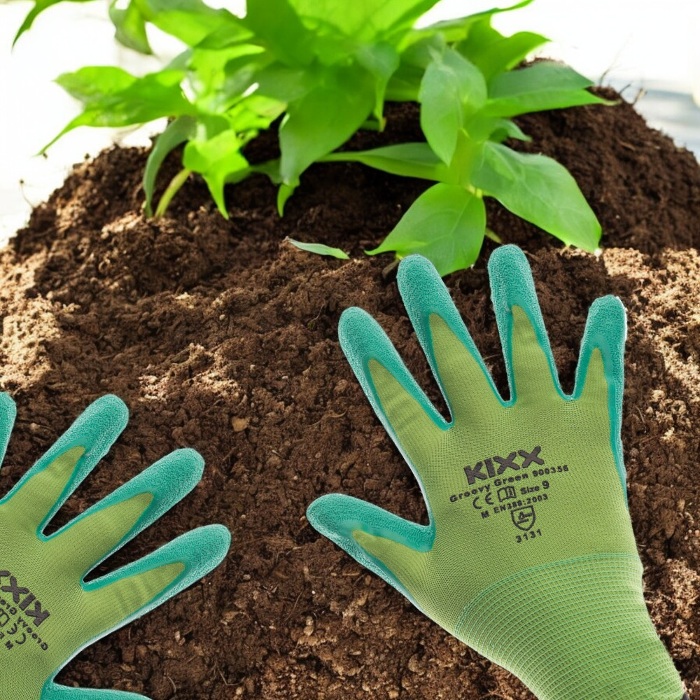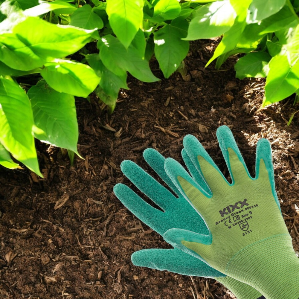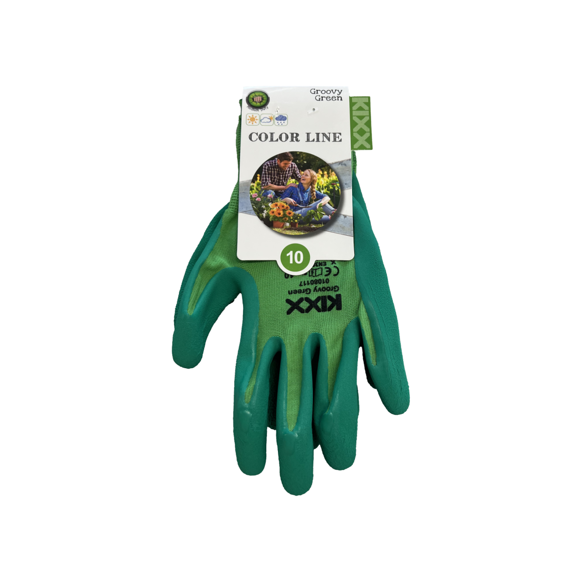 A Kixx Groovy Green 10-es méretű kerti kesztyű ideális társad lehet kerti, háztartási és ház körüli munkák során. A zöld színű, kötött nylon alapanyagú kesztyű jól szellőzik, kézre simul, így kényelmes viseletet nyújt akár hosszabb ideig tartó feladatokhoz is. A tenyérrészen alkalmazott latex bevonat biztos fogást ad és növeli a kesztyű ellenálló képességét.