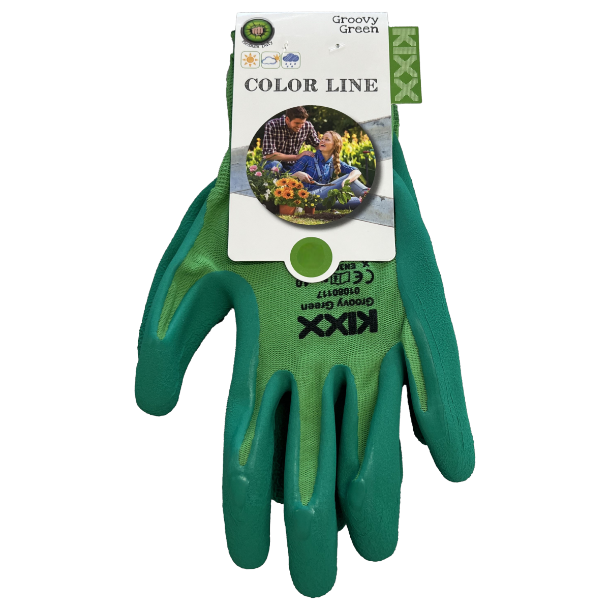 A Kixx Groovy Green 7-es méretű kerti kesztyű ideális társad lehet kerti, háztartási és ház körüli munkák során. A zöld színű, kötött nylon alapanyagú kesztyű jól szellőzik, kézre simul, így kényelmes viseletet nyújt akár hosszabb ideig tartó feladatokhoz is. A tenyérrészen alkalmazott latex bevonat biztos fogást ad és növeli a kesztyű ellenálló képességét.
