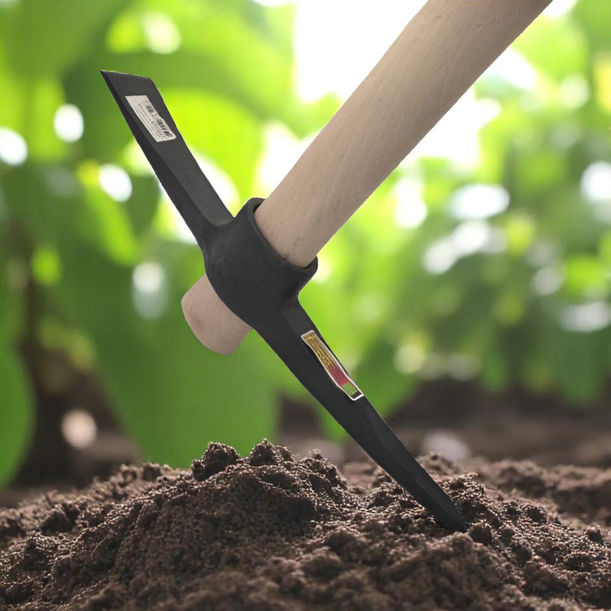 Kovácsolt csákány. 2.25 kg. Alapvető kerti szerszám. A hegyes-lapos csákány egyik oldala egy nagyon masszív hegyben végződő rúd, a másik oldallapra kovácsolt, éles lapos. Keményebb talaj esetén a hegyes végét, talaj fellazításra a lapos végét használjuk. Fa nyele biztos fogást ad használat közben.