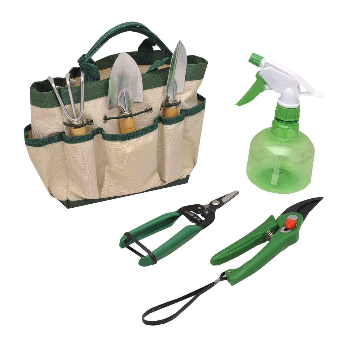7db-os kerti szerszám szett táskával A szett tartalma: 1 db táska, anyaga 600D polyester, mérete: 18x9x15 cm 11 db fa nyelű simító, ültető lapát, gereblye; méretük: 17 cm 1 db kerti olló, műanyag nyéllel 7" 1 műanyag kézi permetező, 400 ml
