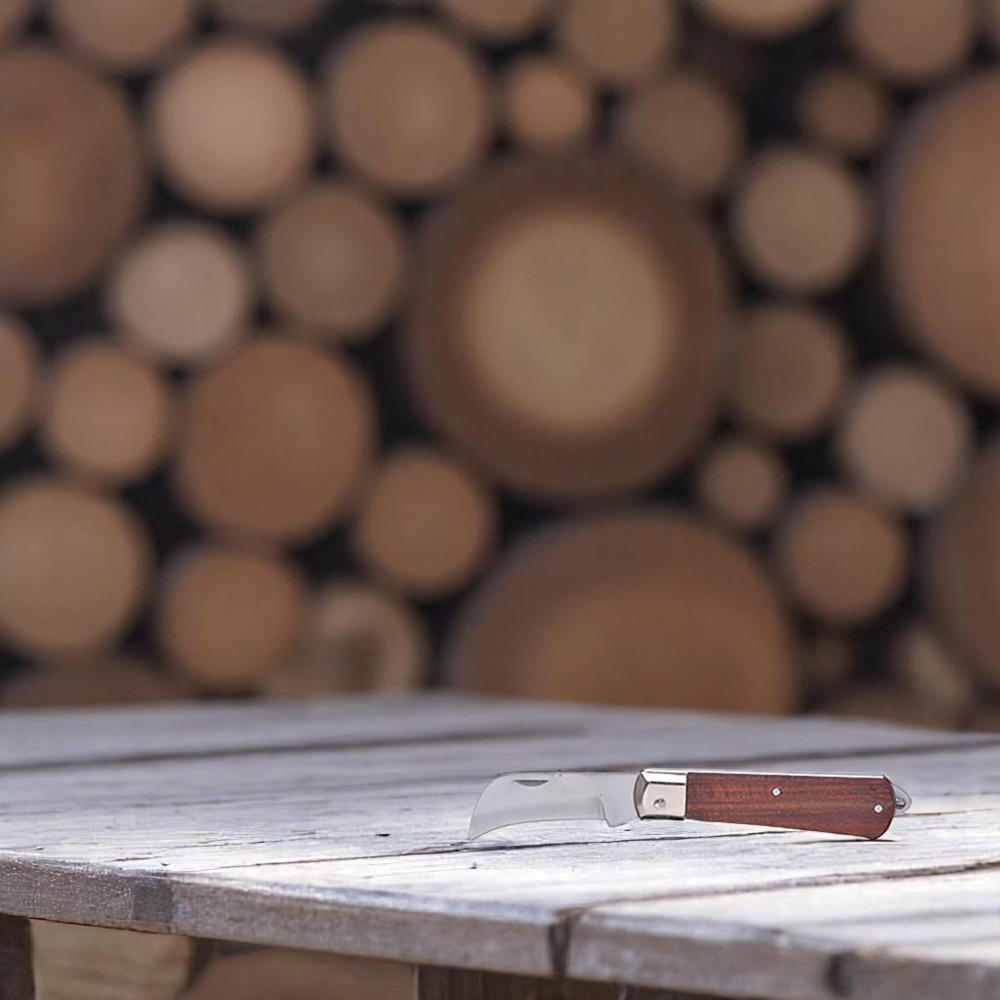 Éles hegyű, összecsukható oltókés fából készült nyéllel, rozsdamentes acél pengével. Alkalmas a csemete vékony kérgének szétválasztására, hogy az oltóágat bele lehessen illeszteni.