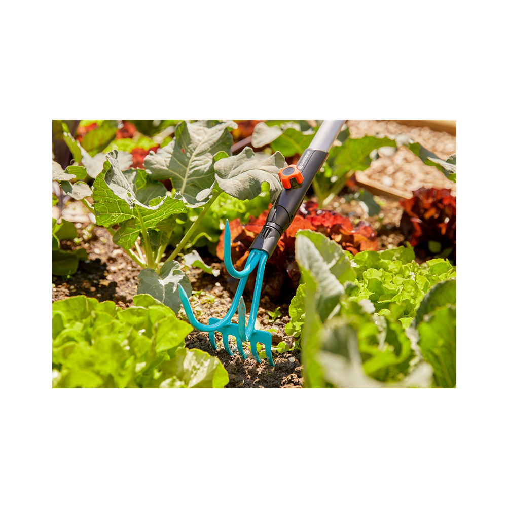 2 az 1-ben eszköz: A gyom meglazítása a talajban karmokkal, a gyom eltávolítása az ágyásról a gereblyével. A combisystem talajlazító-gereblye segítségével könnyedén eltávolíthatod a gazokat. A combisystem rugalmasan használható a cserélhető tartozékoknak köszönhetően. A talajlazító-gereblye az összes combisystem nyéllel kompatibilis, amelyre rászerelhető és rögzíthető. A gereblye és a nyél közötti biztonságos kapcsolat biztosítja, hogy mindig kényelmesen dolgozhass. A talajlazító és a gereblye praktikus kombinációjának köszönhetően két szerszámot kapsz egyben. A talajlazítóval fellazítod, a gereblyével pedig eltávolítod a fellazított gyomot a talajból.