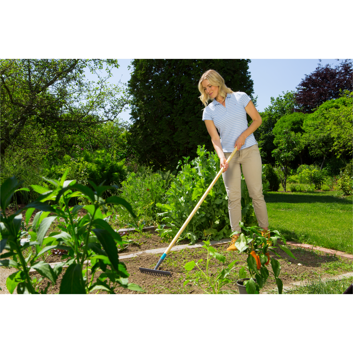 Acél szerszám. Robosztus és tartós, függesztőlyuk az egyszerű tárolásért. FSC® 100%-ban tanúsított fenyőfa nyél. Kiválóan alkalmas gereblyézéshez, egyengetéshez és egyéb talajmunkákhoz.