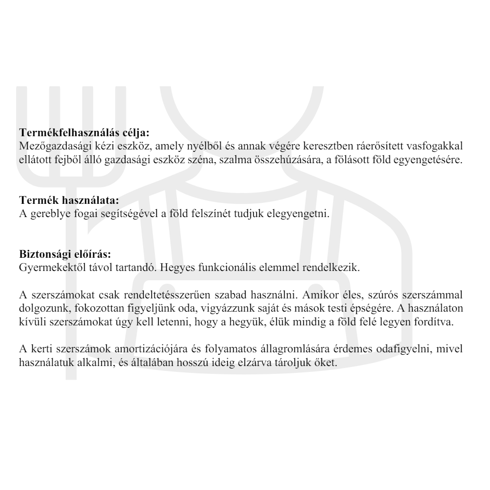 Erős acél fogai hatékonyan gyűjtik össze a leveleket, szénát, szalmát és használható a felásott föld elegyengetésére is.