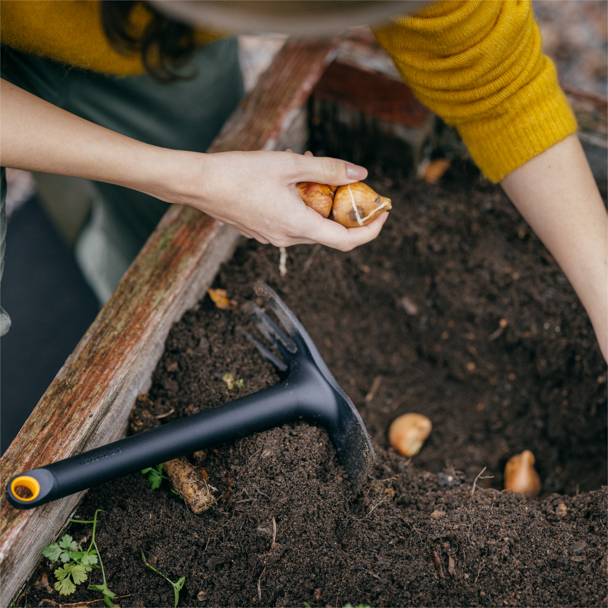 A Fiskars Solid™ ültetőkapa 65%-ban újrahasznosított műanyagból készült, üvegszálakat tartalmaz a tartósság érdekében. Széles, lapos élek a magbarázdák ásásához vagy a kemény gyökerek feldarabolásához. Villás él a talaj levegőztetéséhez, valamint a gyomok és kövek eltávolításához. UV álló. Ergonomikus fogantyú csökkenti a kéz fáradását. A kényelmes akasztónyílás egyszerű tárolási lehetőségeket kínál. A Fiskars Solid™ kerti kéziszerszámok felelősségteljesen előállított, újrahasznosított szerszámok sorozata, amelyek tartósak, kiváló minőségűek és kényelmesen használhatók.