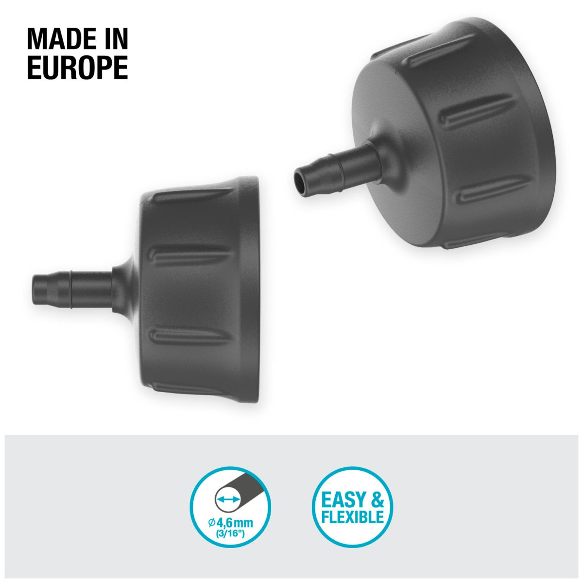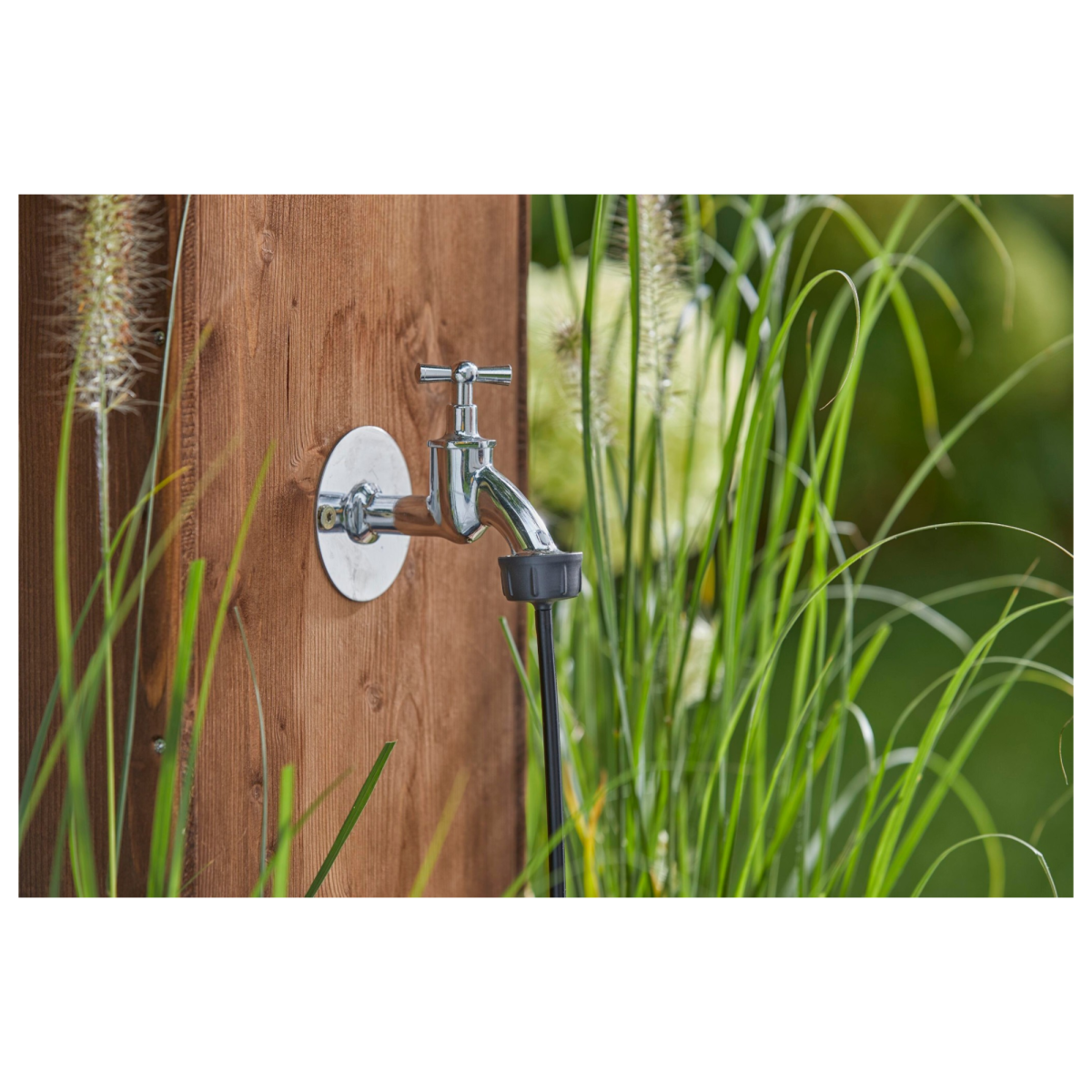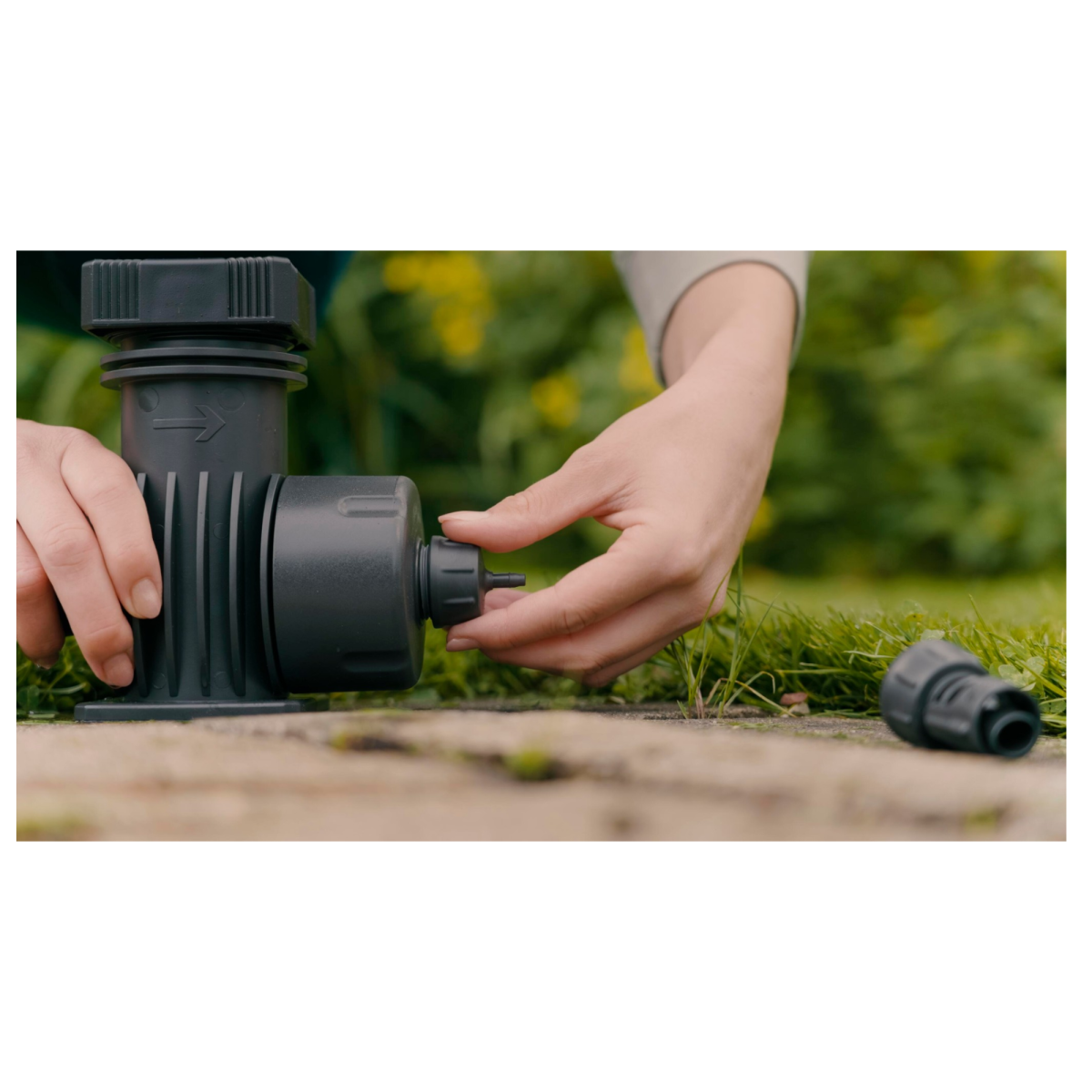A GARDENA Micro-Drip csap-csatlakozóelem praktikus megoldás, ha a Micro-Drip öntözőrendszert közvetlenül a vízcsaphoz szeretnéd csatlakoztatni. Segítségével egyszerűen kialakíthatod az öntözőrendszer kiindulópontját, amelyhez 4,6 mm-es elosztócső vagy csepegtetőcső csatlakoztatható.