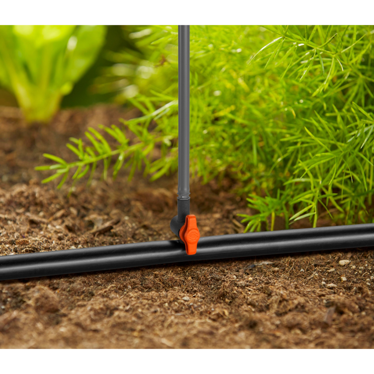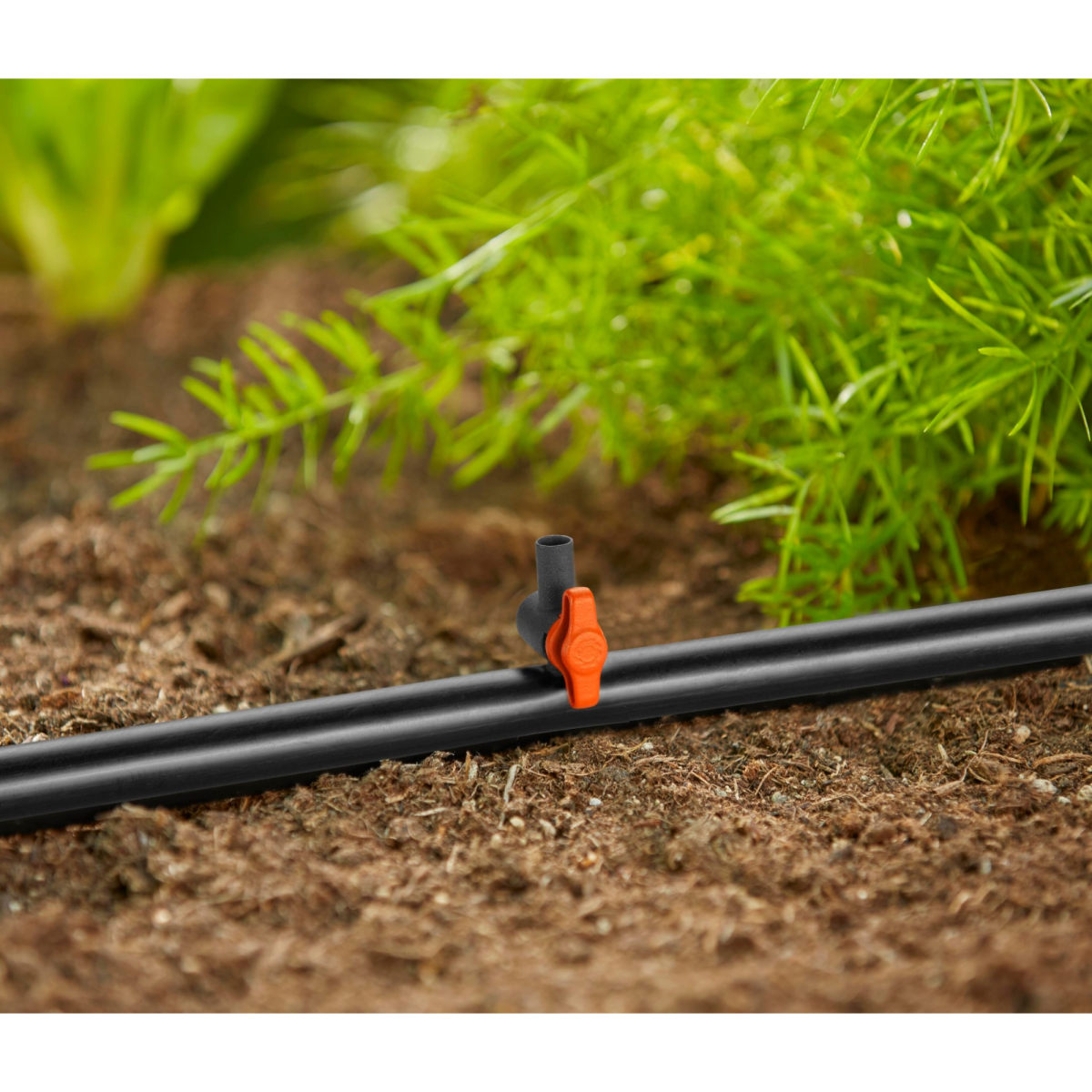 A Micro-Drip-System részeként a szelep egyszerűen beépíthető a csővezetékbe, és szükség esetén könnyen áthelyezhető. A csövekkel történő hosszabbításnak köszönhetően akár magaságyások öntözéséhez is használható.