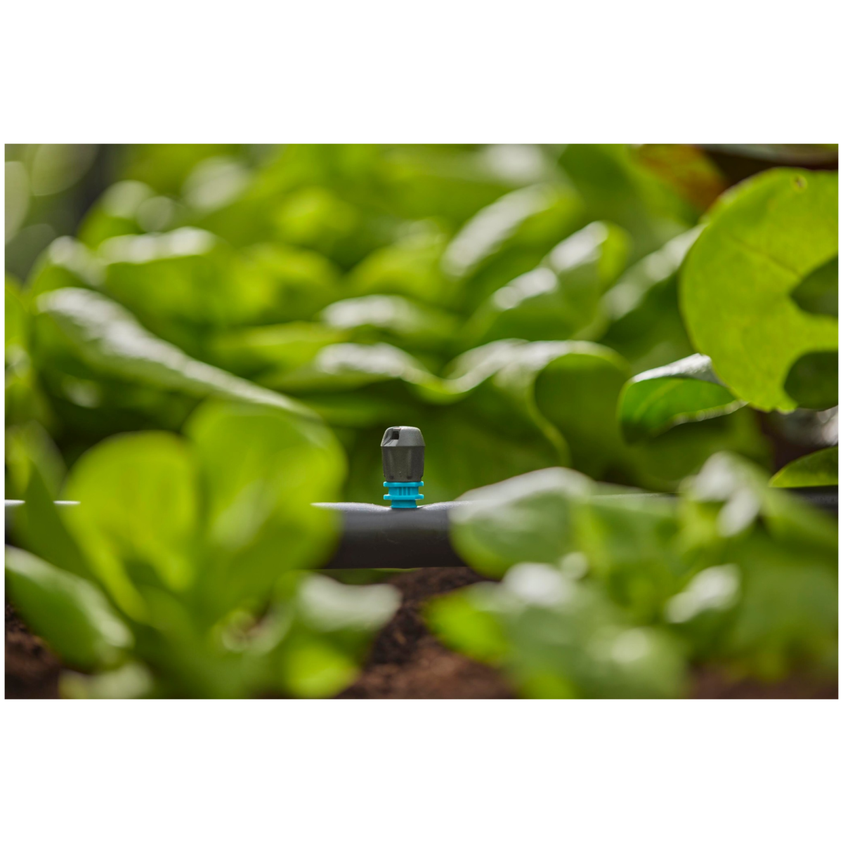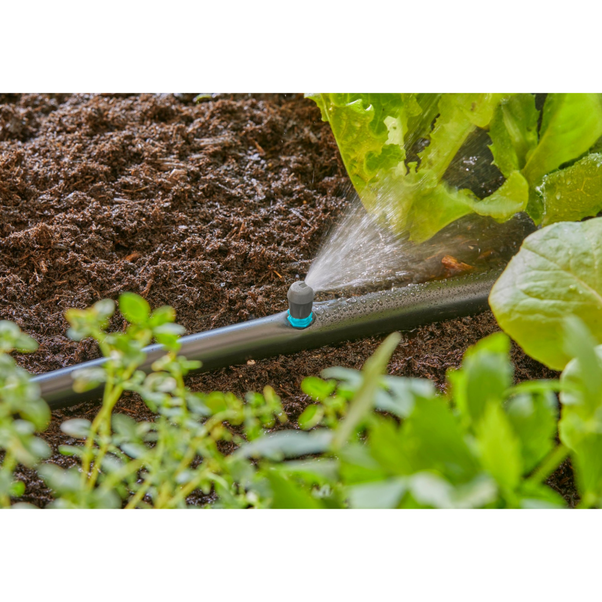 A Micro-Drip-System elem 2,75 méteres hatótávolságot és körülbelül 0,6 méteres öntözési szélességet biztosít. A 13 mm-es vezetékcsőre egyszerűen felszerelhető szerelőeszközzel vagy T-elemmel, így gyorsan telepíthető és azonnal használatba vehető. Az intuitív kialakításnak köszönhetően a szóráskép a fúvókán is könnyen felismerhető.