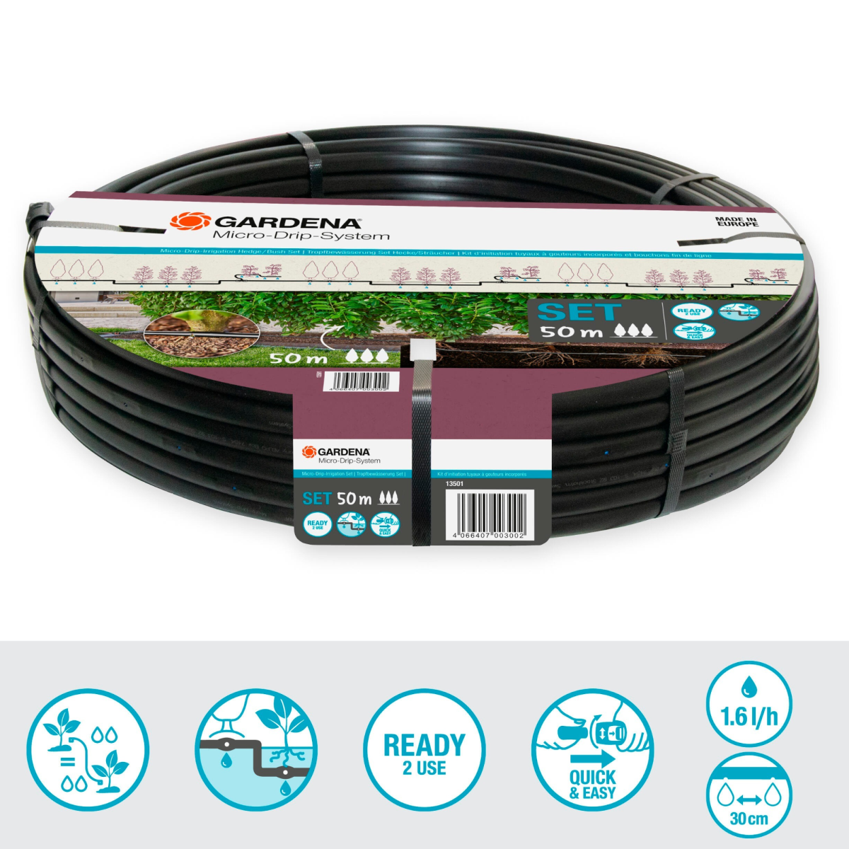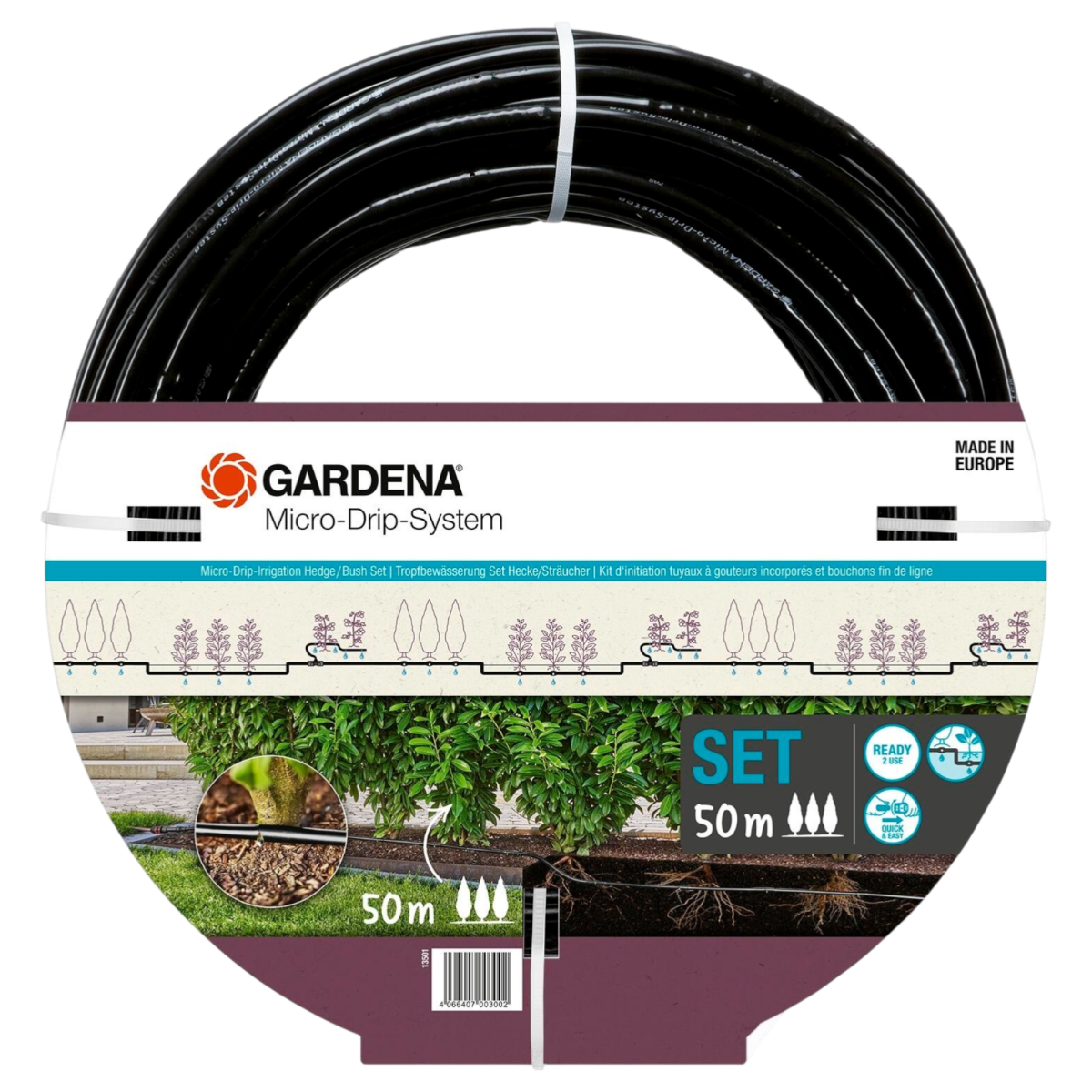 A Gardena MD csepegtető cső készlet praktikus megoldás növénysorok, sövények vagy szegélynövények egyenletes öntözésére. A 50 méteres rendszer föld felett és föld alatt is telepíthető, így rugalmasan alkalmazkodik a kert kialakításához.