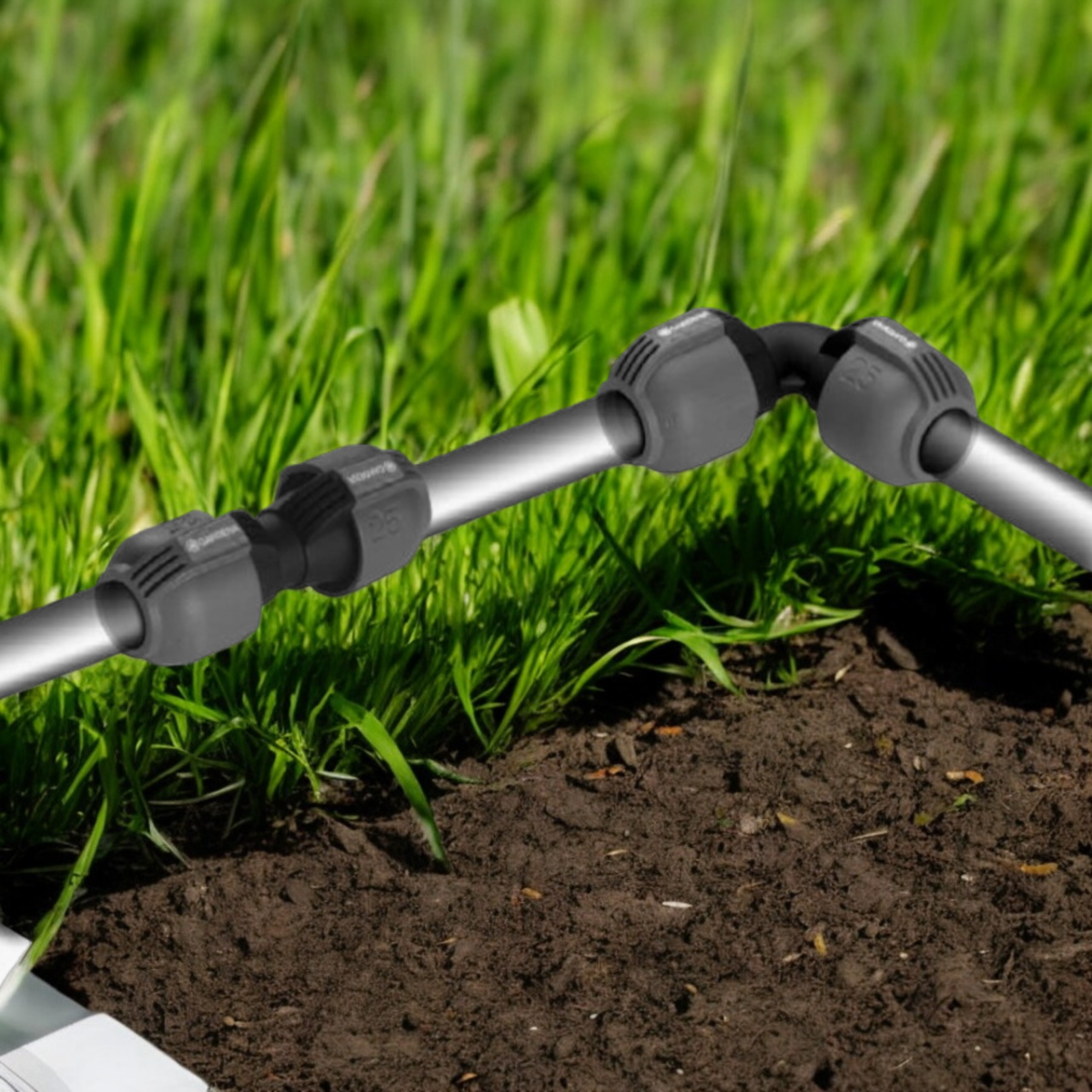 A Gardena Sprinklersystem részét képező Gardena 25 mm-es L-elem az vezetékcső irányának megváltoztatására szolgál. A szabadalmaztatott "Klikk és Kész" gyorscsatlakozási technológiának köszönhetően az össze- és szétszerelés egyszerűen, szerszám nélkül történik - csupán a csavaros csatlakozást kell 140°-kal elforgatni.