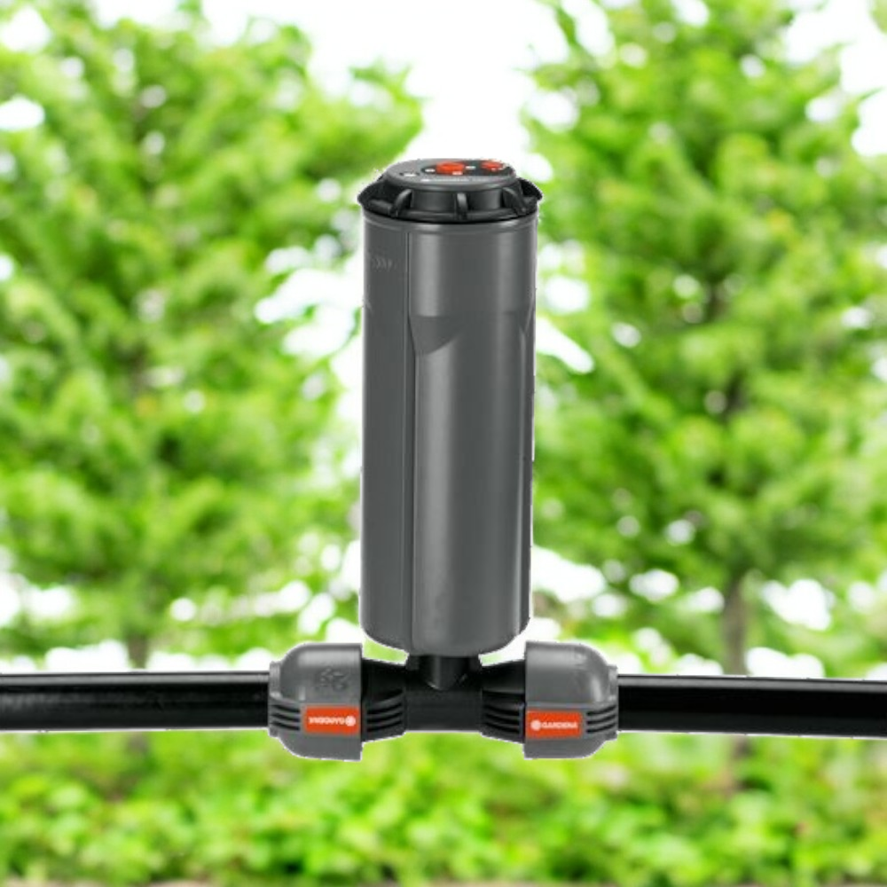 A GARDENA Sprinklersystem részét képező GARDENA 25 mm x 1/2" külső menetes T-elemmel S 80 süllyesztett esőztető vagy T 100 vagy T 200 turbinás esőztető csatlakoztatható a csővezetékhez. A szabadalmaztatott "Klikk és Kész" gyorscsatlakozási technológiának köszönhetően az össze- és szétszerelés egyszerűen, szerszám nélkül történik - csupán a csavaros csatlakozást kell 140°-kal elforgatni. A T-elem a biztonságos, szivárgásmentes működés érdekében öntömítő menetcsatlakozással rendelkezik.