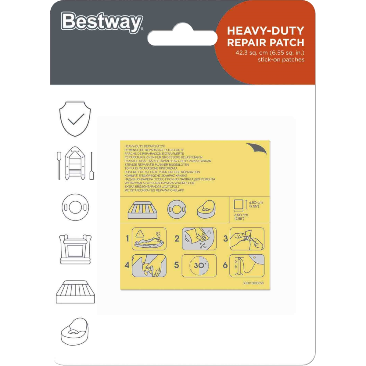 A Bestway javító folt ideális választás kisebb sérülések gyors és egyszerű javítására föld feletti medencék fóliáján. A 6,5×6,5 cm-es öntapadós foltok kizárólag száraz felületen alkalmazhatók, így biztosítva a megfelelő tapadást. A készlet 10 darab, egyenként 42,3 cm²-es foltot tartalmaz, amely elegendő több kisebb hiba orvoslásához is.