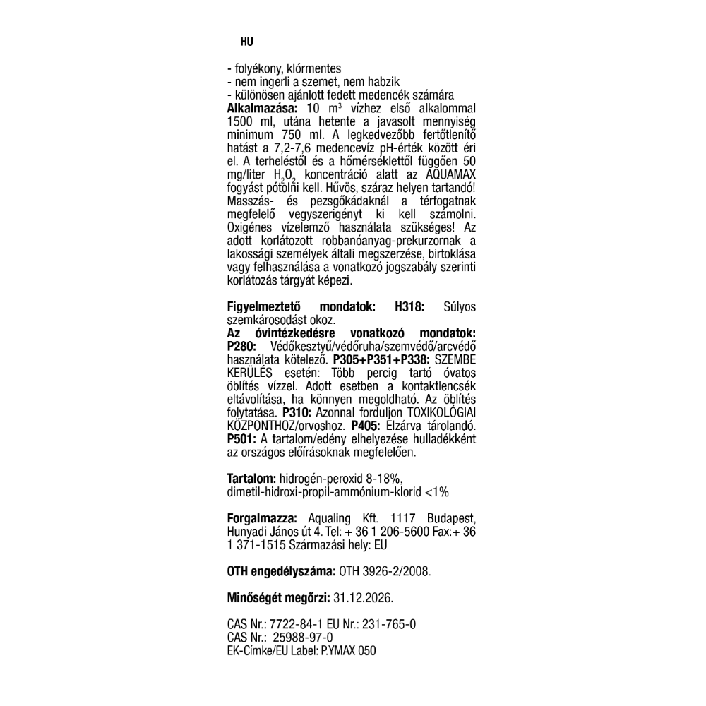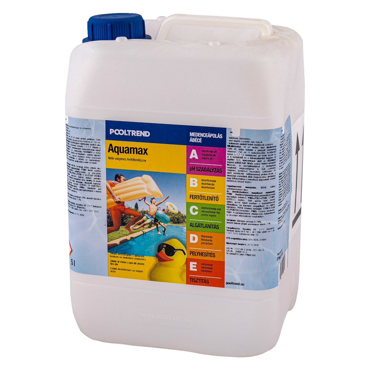 Aquamax oxigénes fertőtlenítőszer algaölő adalékkal, 5 literes kiszerelésben. Teljesen szagtalan, habzásmentes, különösen alkalmas masszázs- és élménymedencékhez. Adagolás 10 m3 vízhez első alkalommal 1500 ml, utána hetente a javasolt mennyiség minimum 750 ml. A legkedvezőbb fertőtlenítő hatást a 7.2-7.6 medencevíz pH-érték között éri el. A terheléstől és a hőmérséklettől függően 50 mg/liter H2O2 koncentráció alatt az Aquamax fogyást pótolni kell. Masszás- és pezsgőkádaknál a térfogatnak megfelelő vegyszerigényt ki kell számolni.