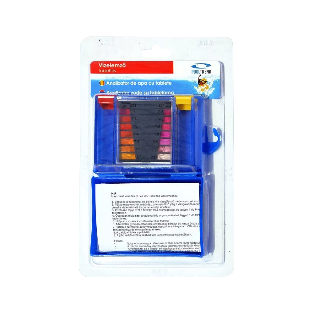 A Pooltrend tablettás vízelemző készlet megbízható és pontos megoldás a medencevíz rendszeres ellenőrzéséhez. A készülék lehetővé teszi a szabad klór és a pH-érték gyors és egyszerű meghatározását tablettás reagens segítségével. Használata elengedhetetlen a vízminőség fenntartásához és a biztonságos fürdőzéshez.
