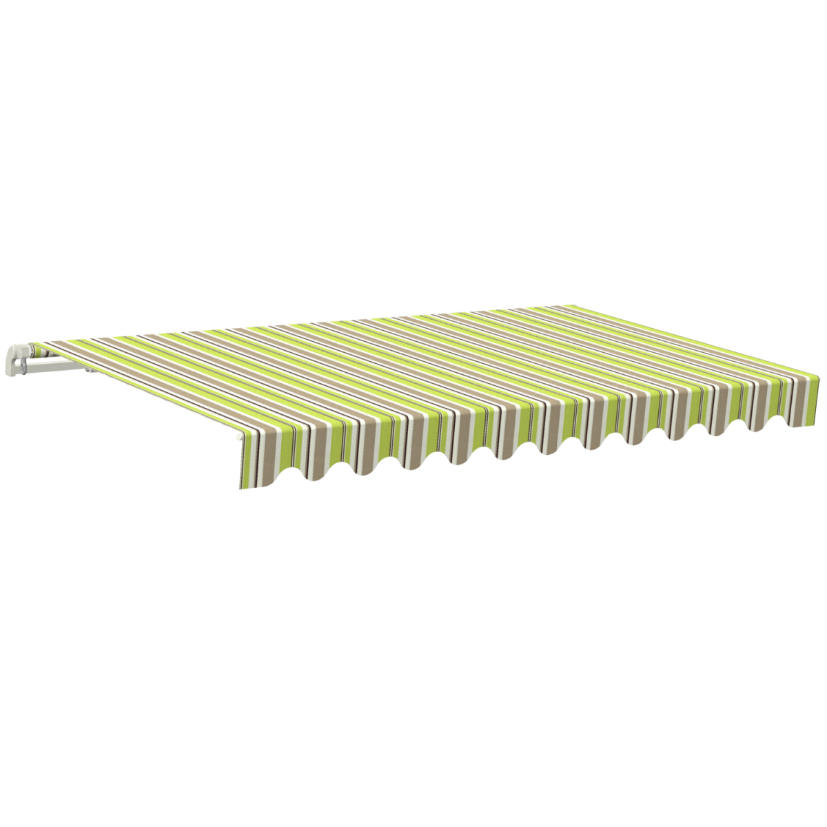 Homlokzatra szerelhető, kézi tekerős napellenző. Tökéletesen alkalmas erkélyek, teraszok, kiskereskedelmi vendéglátó egységek kiülős részeinek árnyékolására. A textil anyag nem vízálló, így az esőt átengedi. Csíkos mintája különösen hangulatos.