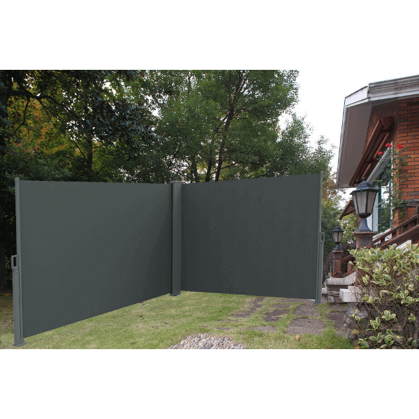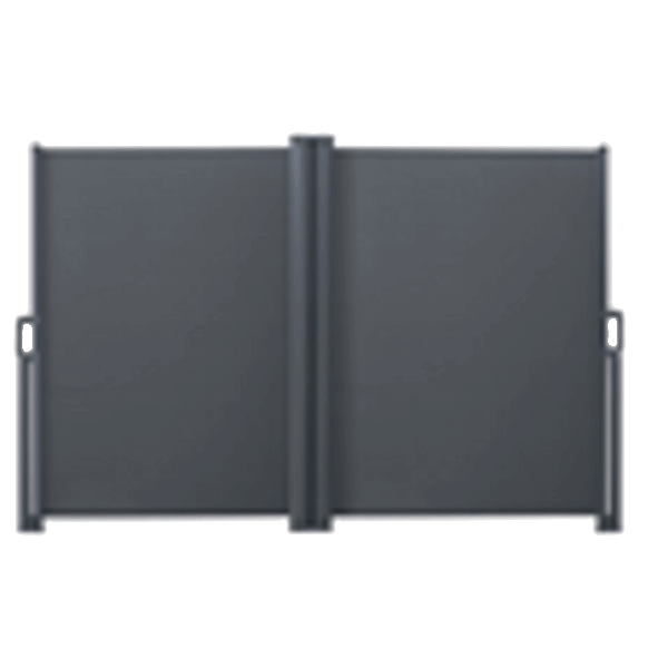 Függőleges napellenző sötét antracit színben. Összecsukható árnyékoló felület mérete: 1,5x6m, porfestett keret, PU rétegelésű poliészter szövet, 180 g/m².