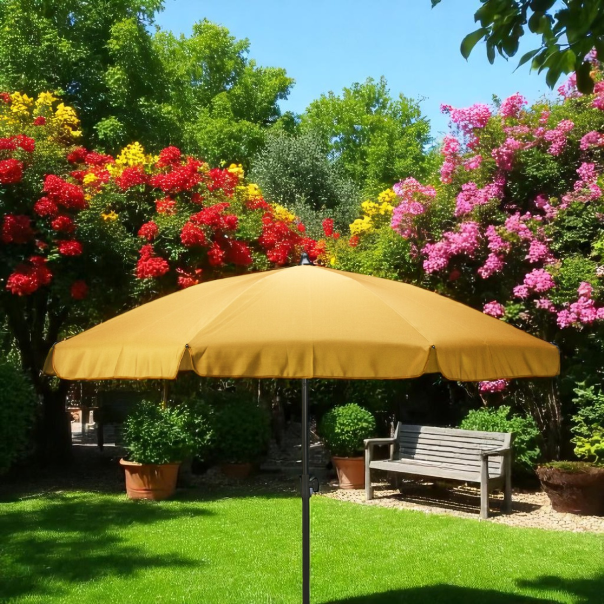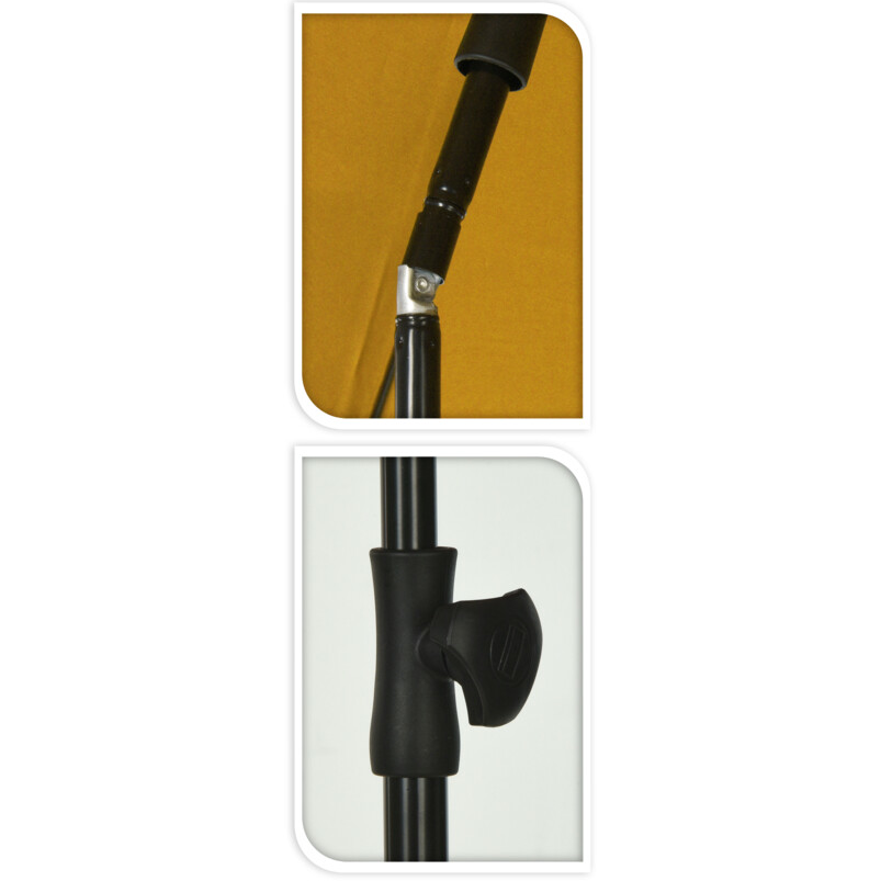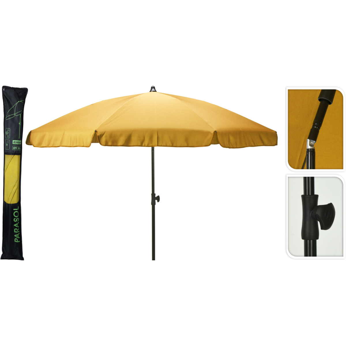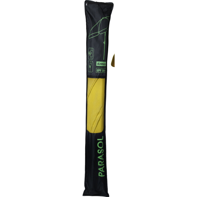 A napernyő magassága 200 cm, átmérője nyitott állapotban 185 cm. Fém tartócsővel rendelkezik, melynek átmérője: 22/25 mm. Az ernyő anyaga poliészter, sűrűsége 180 g/m2. Sárga színben érhető el. UV védelme: UPF 30+. Hordtáskával együtt kerül értékesítésre.