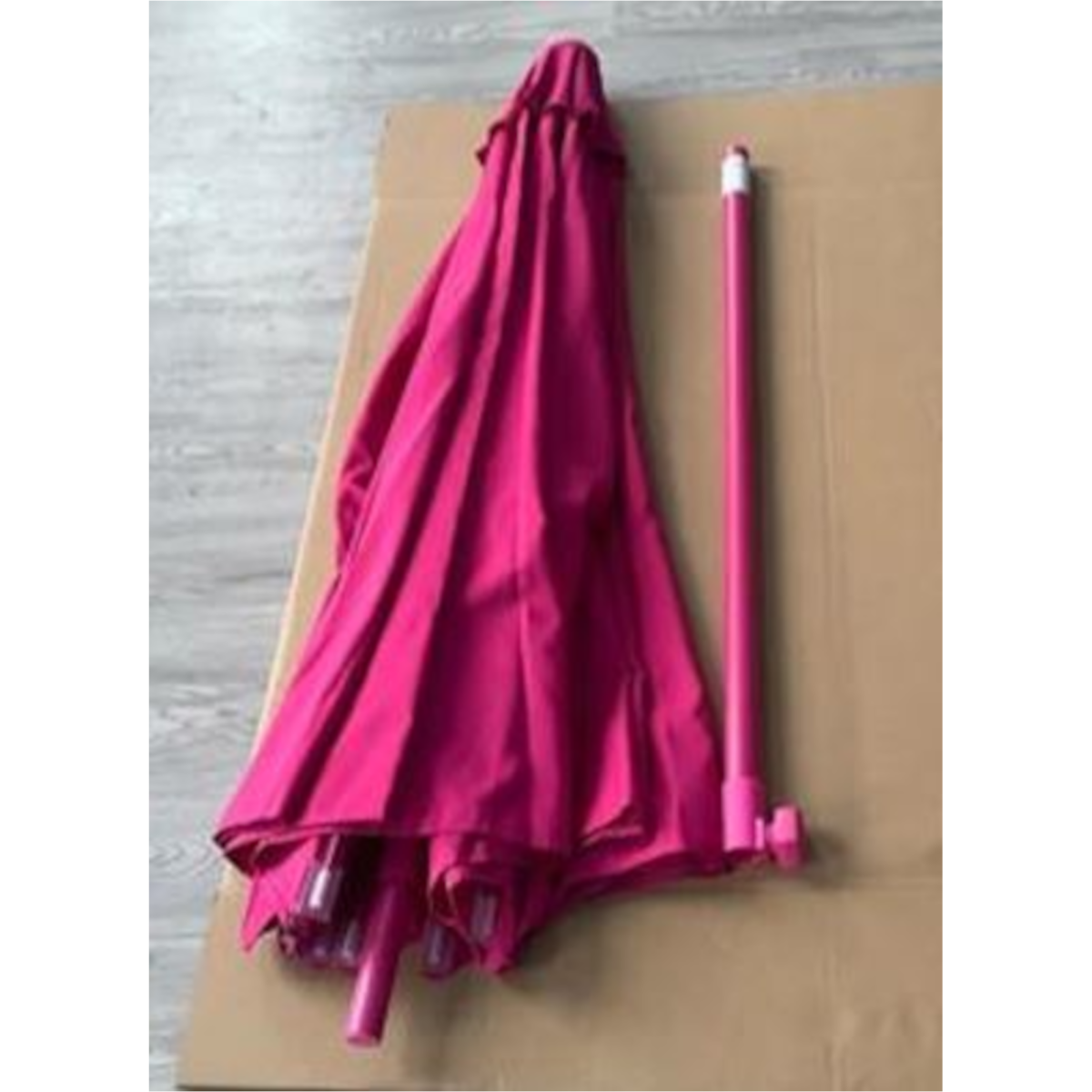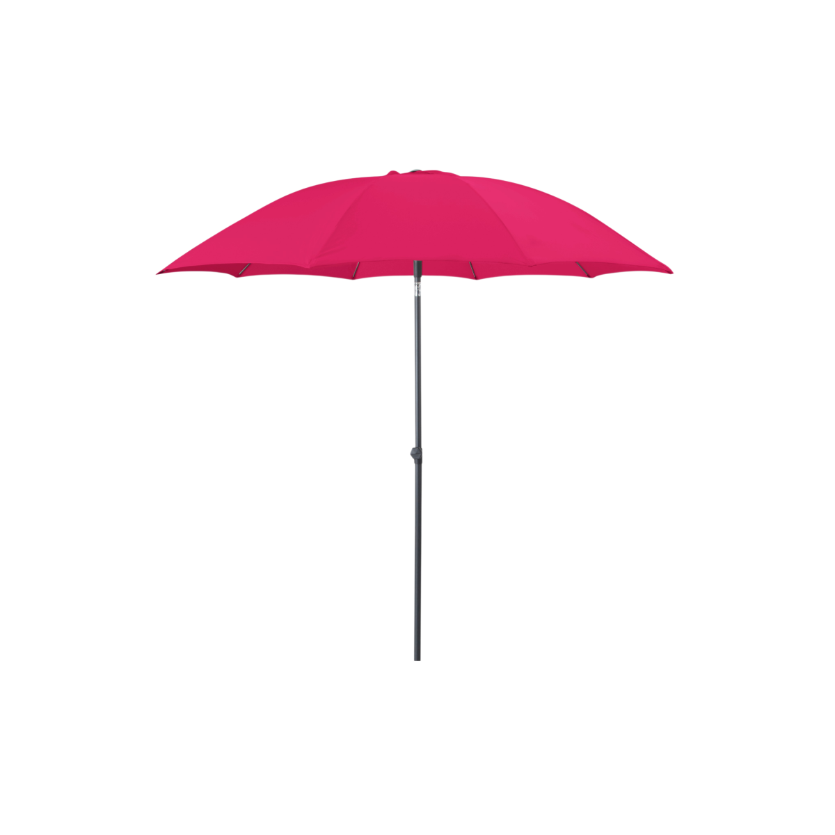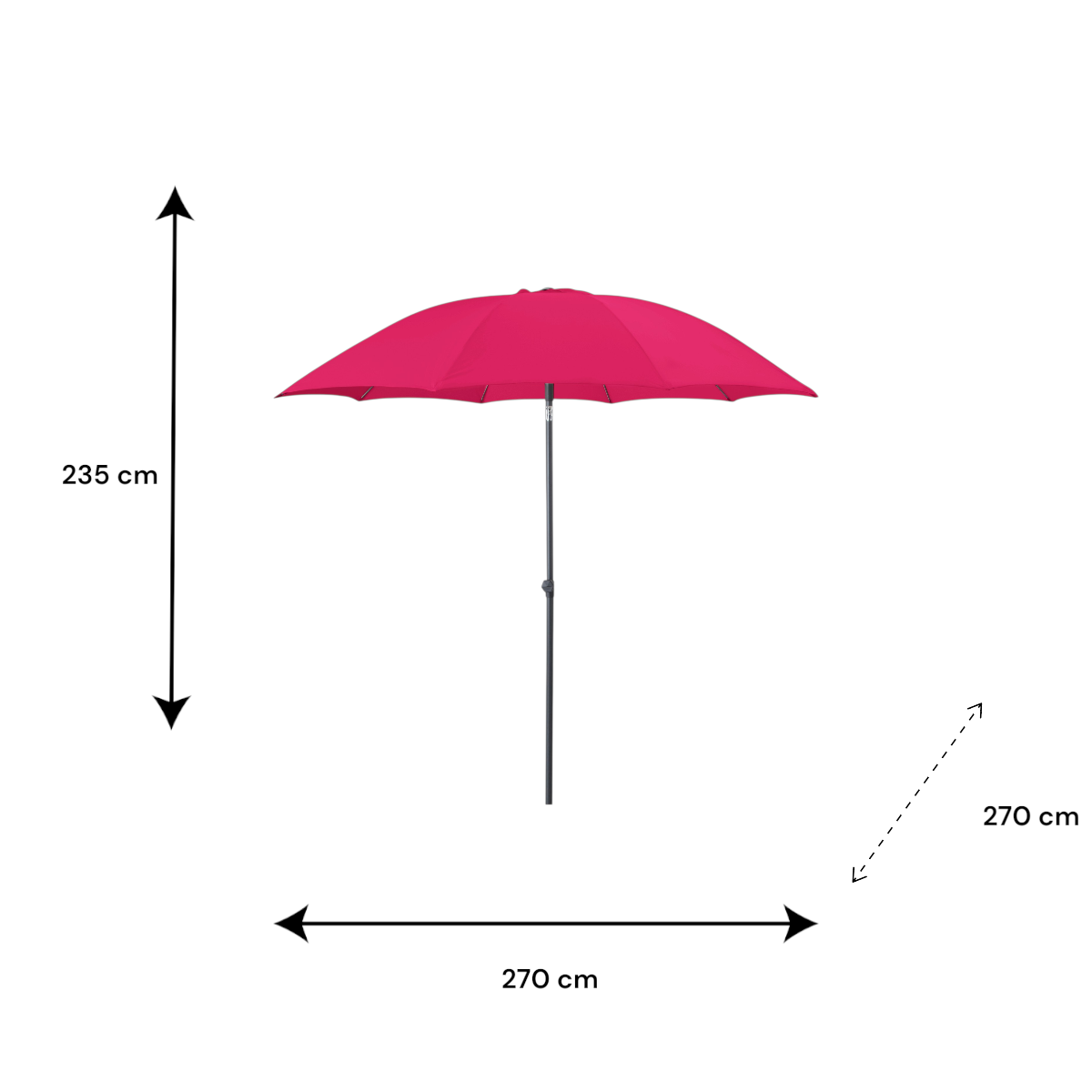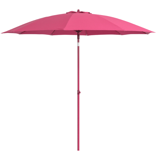 270 cm-es napernyő, pink színű huzattal, 180g/m2 poliészter anyagból, vízlepergető kikészítéssel. A tartórúd dönthető, porszórt alumíniumból készült; átmérő: 8 mm; üvegszál erősítésű merevítő bordákkal ellátott.