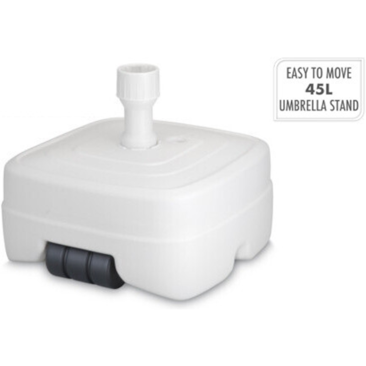 45 literes, műanyag napernyőtalp, mely 33-50 mm szárvastagságú napernyőkhöz javasolt.