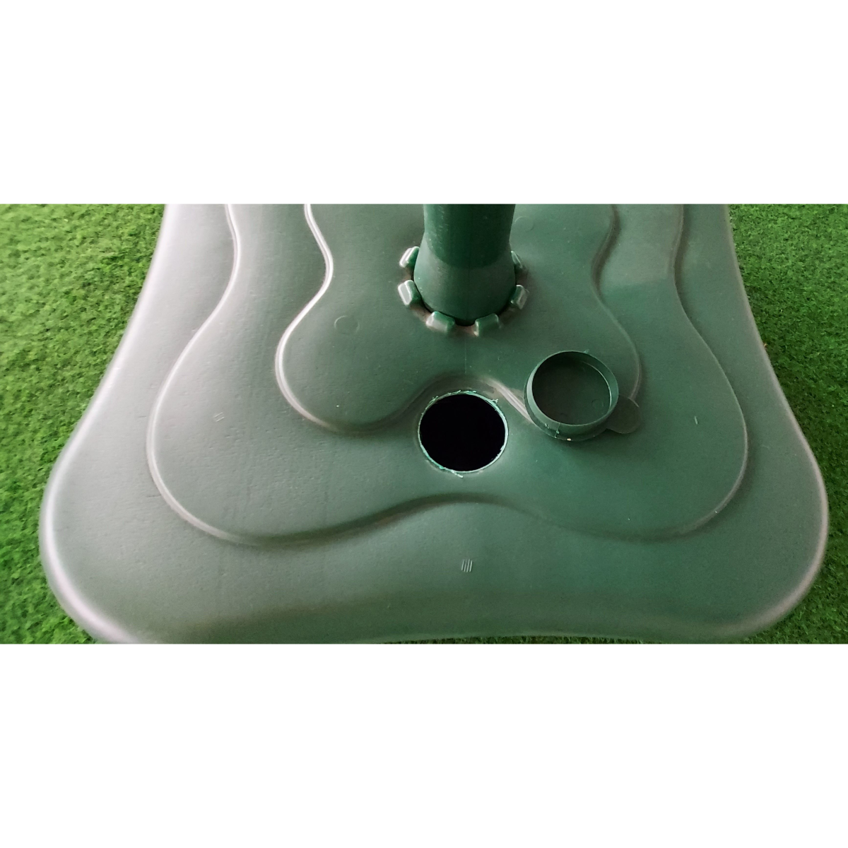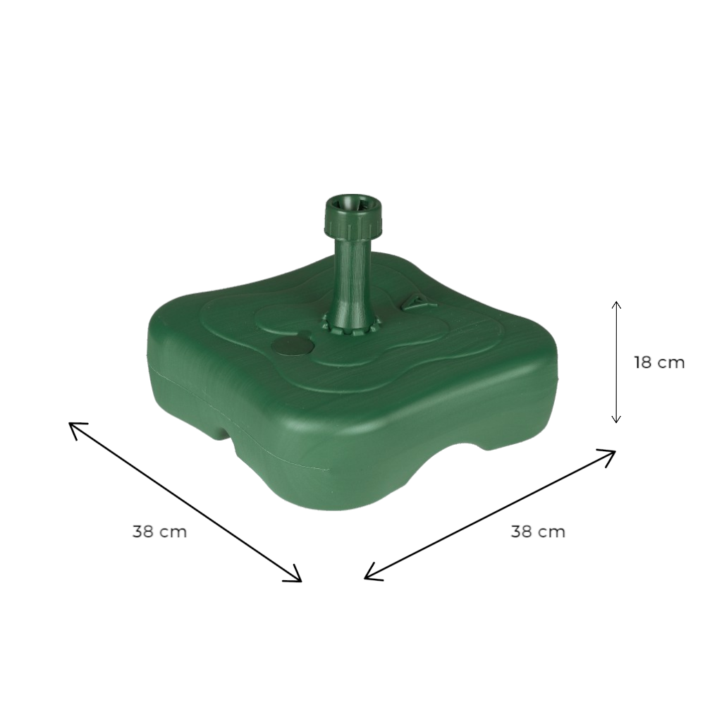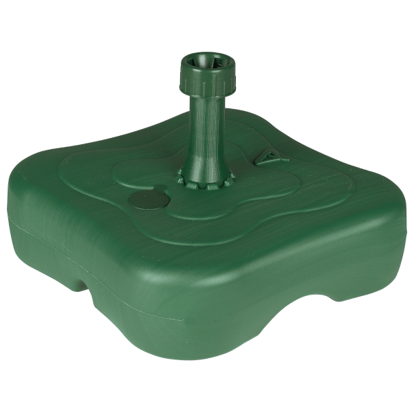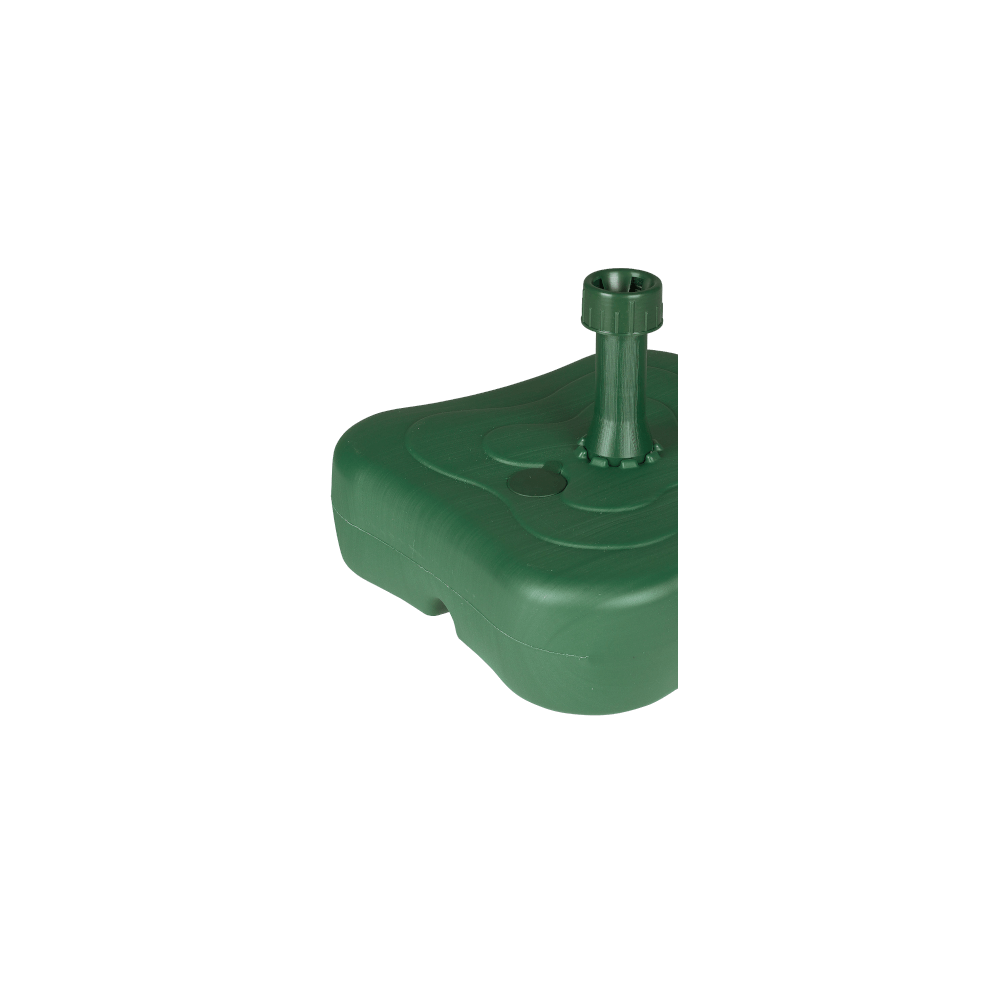 Zöld, műanyag napernyőtartó, vízzel tölthető. A műanyag napernyőtalp kiváló választás, ha stabil alapot szeretnél biztosítani napernyődnek a kertben vagy teraszon.