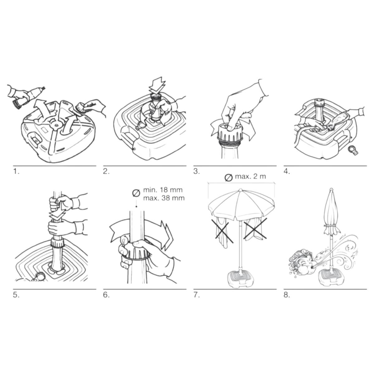 Egyszerűen töltsd fel vízzel vagy homokkal – homok esetén 25 kg-os töltőtömeggel még stabilabb lesz –, hogy biztosítsd a napernyő erős és biztonságos rögzítését.