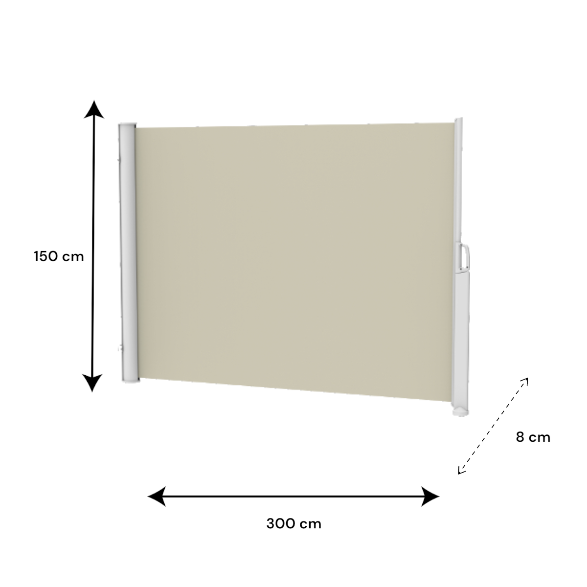 Függőleges összecsukható napellenző, bézs színben. Árnyékoló felület mérete: 1,5 x 3 m. Falra szerelhető.