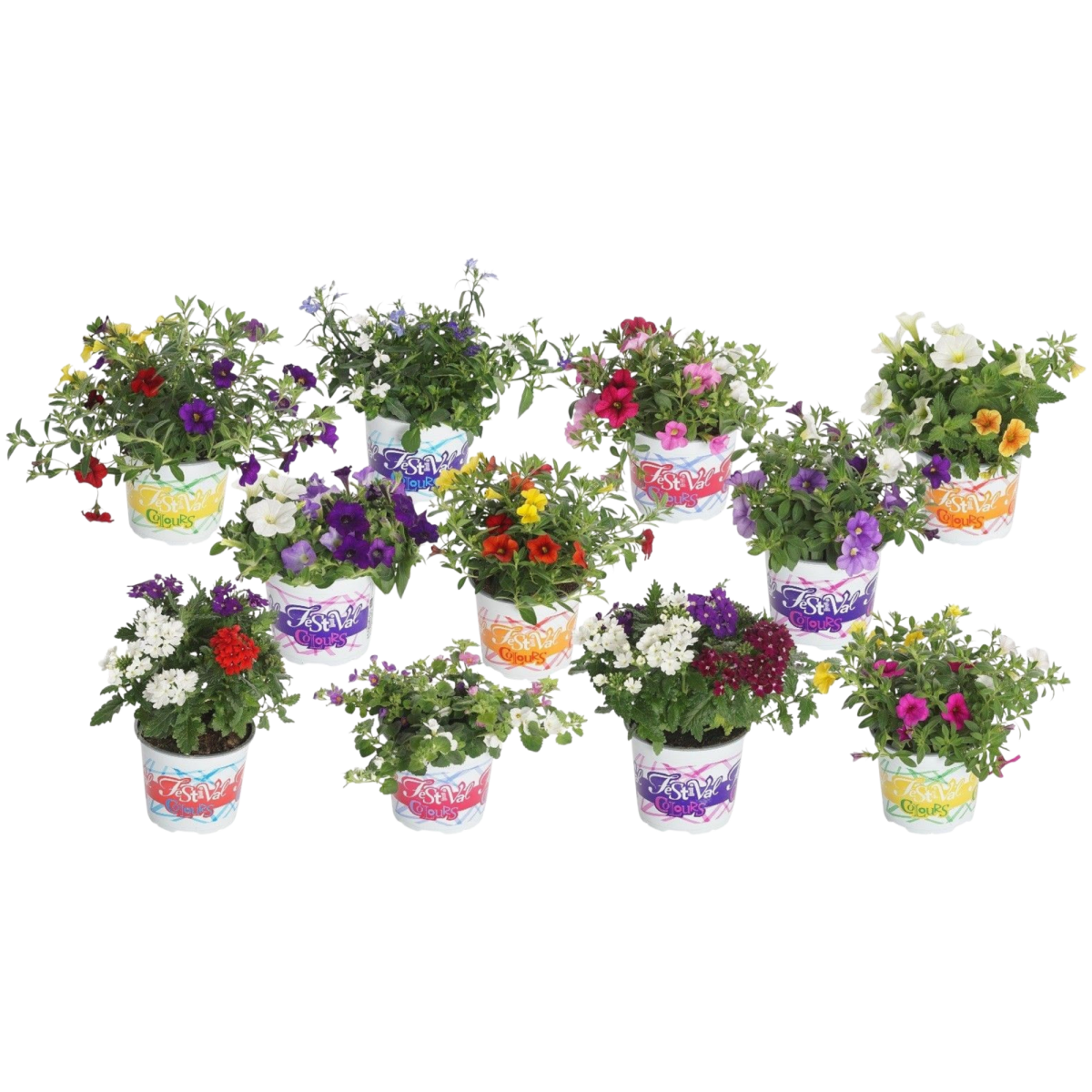 A ‘Festival’ virágzó növénymix egy színes egynyári növényválogatás, amely különböző virágzó fajtákat tartalmaz egy 12 cm-es cserépben.