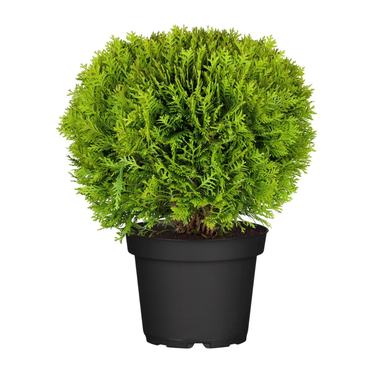 Gömb thuja mix 4 literes konténerben. Sovány talajon, öntözés, tápanyag-ellátás nélkül a növény csak vegetálni fog, sehova nem fejlődik. Az egészséges állapot csak komoly odafigyeléssel tartható fenn, amelyek a következők: folyamatos öntözés, rendszeres tápanyag-utánpótlás, metszés, alakítás, növényvédelem.