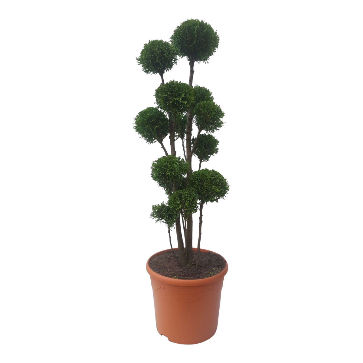 A Tuja Pom-pom 120 cm magas, formára nyírt örökzöld dísznövény, amely különleges, gömbös tagolású megjelenésével igazán látványos eleme lehet a kertnek vagy a bejárat környezetének. A 14 cm-es cserépben nevelt növény gondosan alakított, dekoratív formával kerül forgalomba.