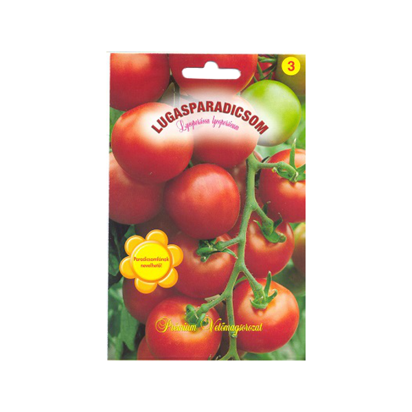 PRÉMIUM VETŐMAG PARADICSOM LUGAS "Fűtetlen fólia alatti vagy szabadföldi termesztésre alkalmas, karós hibrid paradicsom. Bogyói megnyúlt gömb alakúak, 60-70 g tömegűek. Redkívül bőtermő,jó ízű fajta. Magyar nemesítés. "