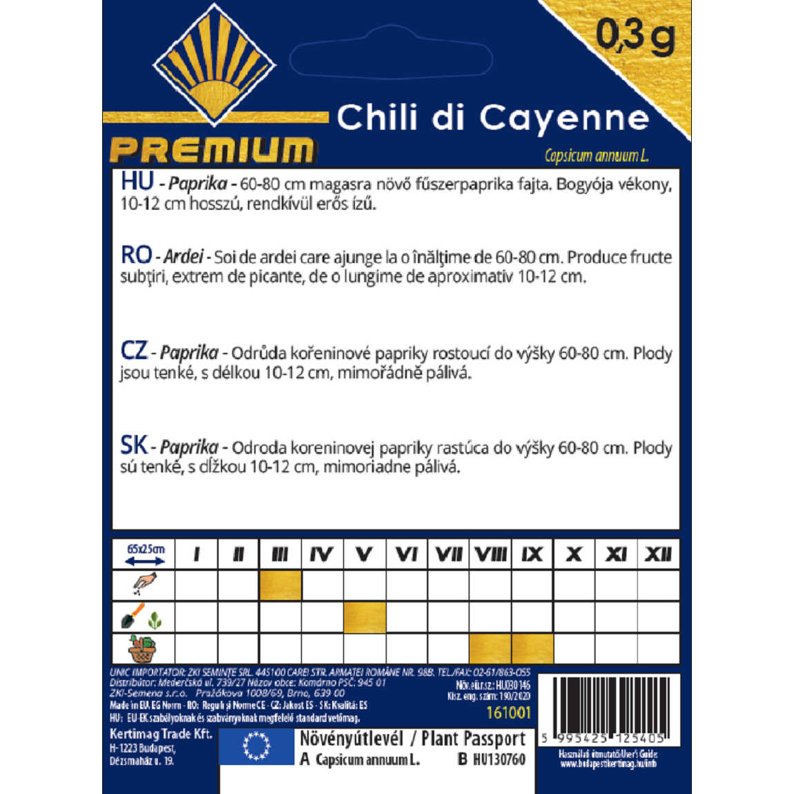 A Chili di Cayenne egy erős fűszerpaprika fajta, amely 60–80 cm magasra nő. A vékony, 10–12 cm hosszú termések intenzív csípősségükkel ideálisak friss felhasználásra, szárításra vagy darálásra is.