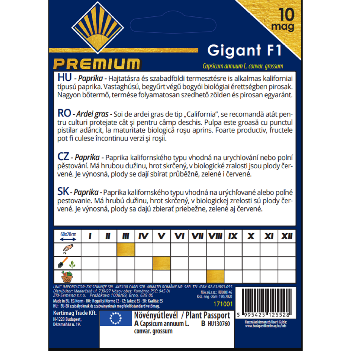 A Gigant F1 egy erőteljes növekedésű, kaliforniai típusú paprika, amely hajtatásra és szabadföldi termesztésre is alkalmas. Vastag húsú, begyűrt végű bogyói biológiai érettségben pirosak, de zölden is szedhetők és felhasználhatók. Megbízhatóan és hosszan terem, így ideális választás lehet mind házikerti, mind hobbitermesztés céljára.