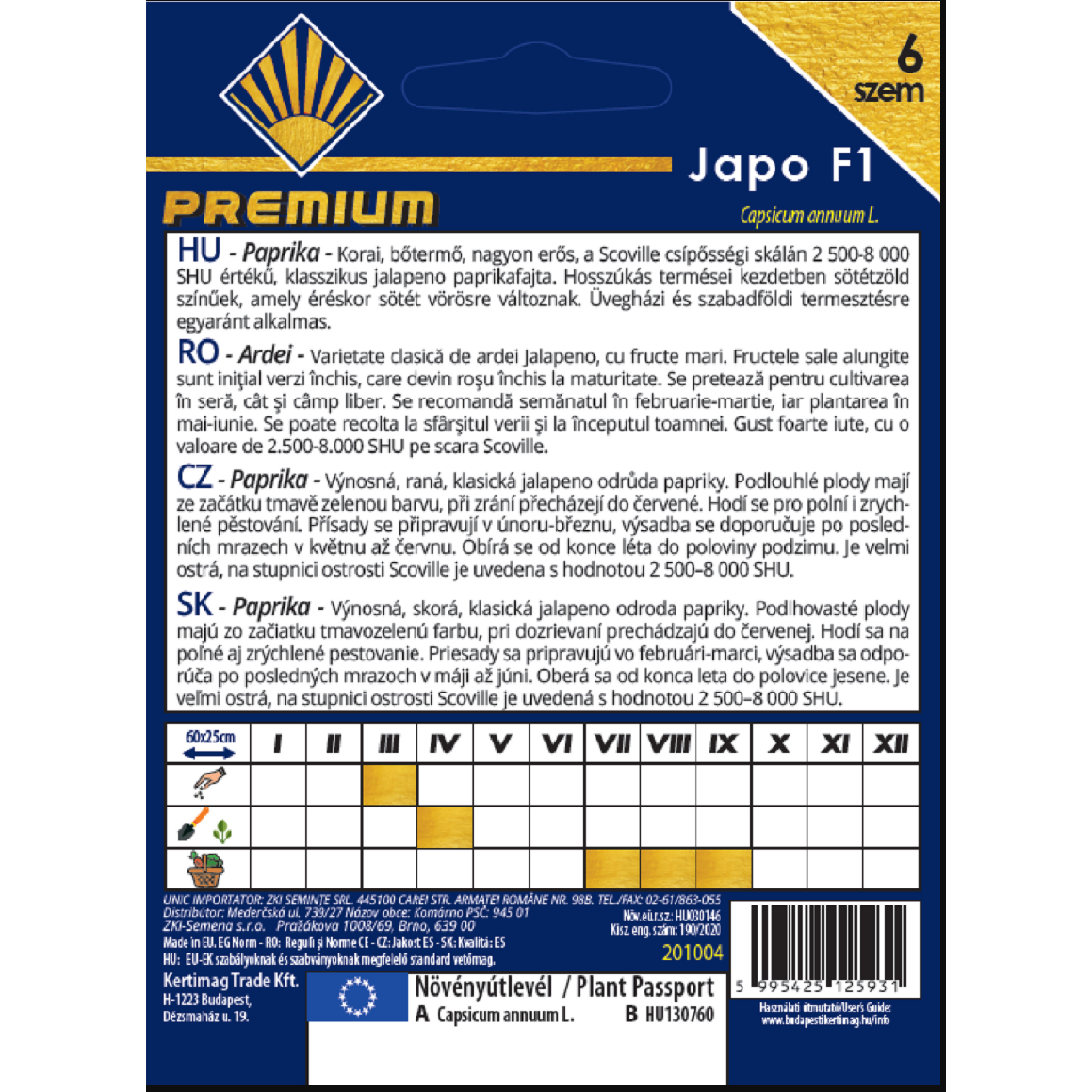 A JAPO F1 egy korai, bőtermő, klasszikus jalapeno paprikafajta, amely üvegházi és szabadföldi termesztésre egyaránt kiválóan alkalmas. Termései hosszúkás alakúak, sötétzöldből sötétvörösre érnek, karakteres, változó erősségű csípősséggel – a Scoville-skálán 2 500–8 000 SHU között.