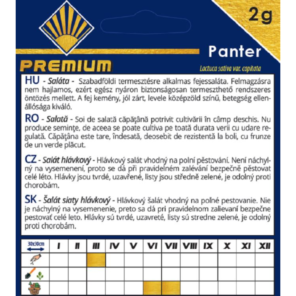 A Panter prémium fejessaláta kifejezetten szabadföldi termesztésre ajánlott fajta, amely nem hajlamos felmagzásra, így rendszeres öntözéssel egész nyáron biztonsággal nevelhető. Feje kemény, jól zárt, levelei középzöldek, és a fajta betegségekkel szembeni ellenálló képessége kiemelkedő. A csomag hátoldalán szereplő információk alapján 30×30 cm-es térállás és tavaszi–nyári vetés javasolt a sikeres termesztéshez.