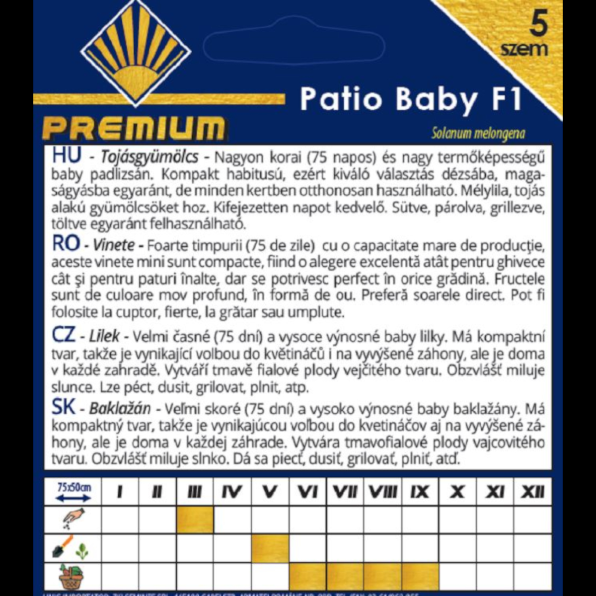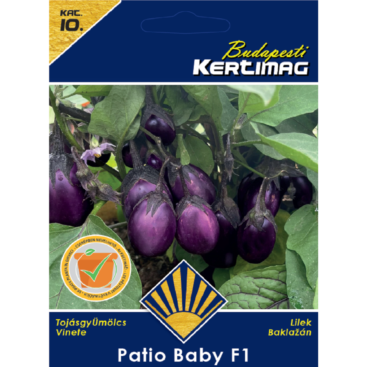 A Patio Baby F1 különlegesen korai, kb. 75 nap alatt érő, nagy termőképességű mini padlizsán fajta. Kompakt növekedésű, ezért ideális választás balkonládába, dézsába vagy magaságyásba, és a kisebb kertekben is könnyen nevelhető. Fényigényes növény, amely bőségesen hozza a mélylila, tojás alakú terméseket. A konyhában sokoldalúan felhasználható: sütve, párolva, grillezve vagy töltve is remekül elkészíthető.