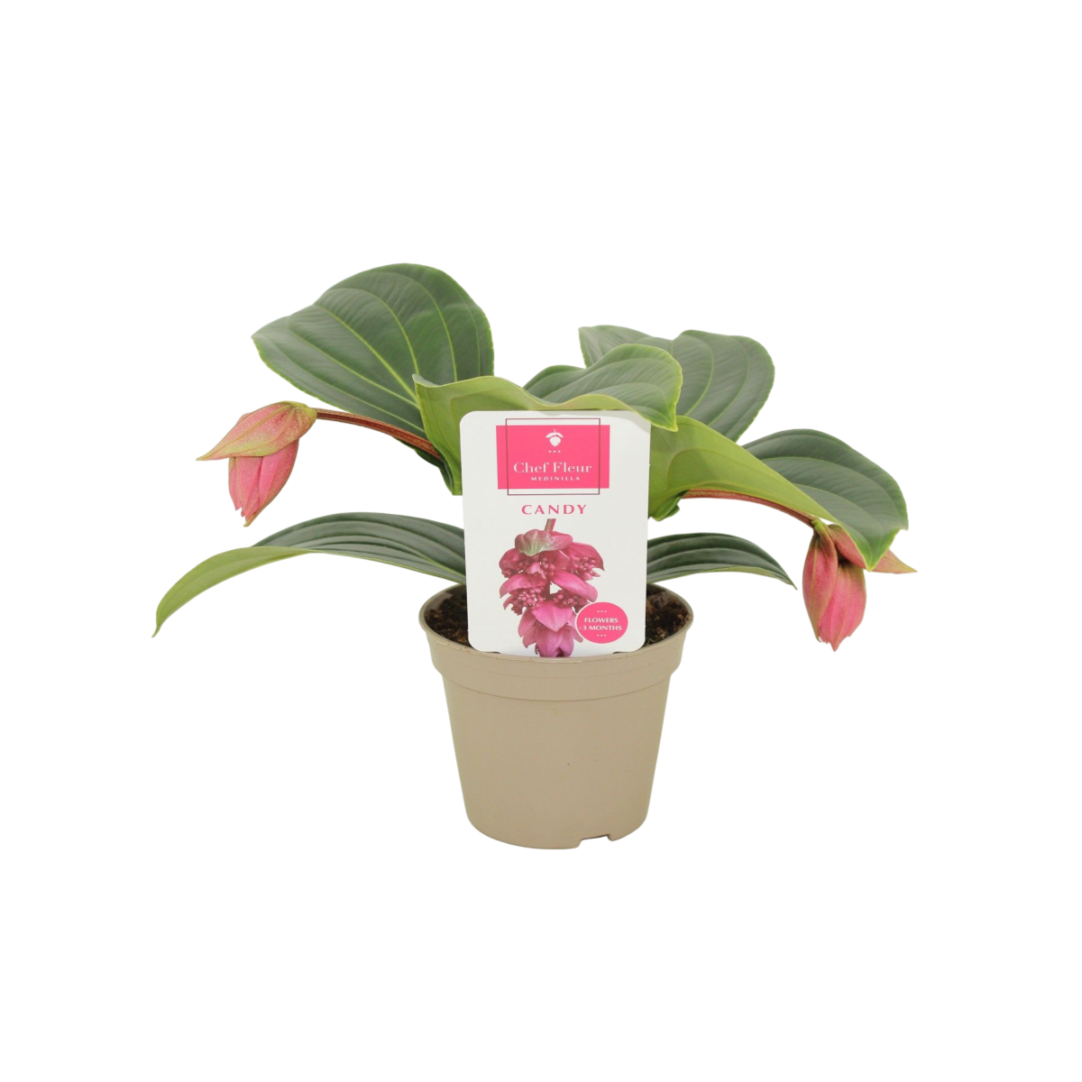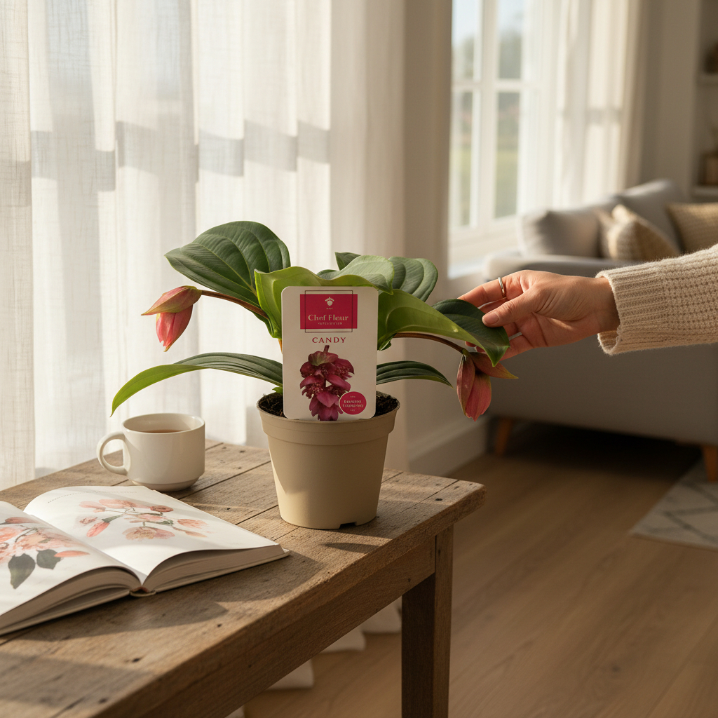 A pompás medinilla Candy (Medinilla magnifica) különleges megjelenésű, dekoratív szobanövény, amely elegáns virágzatával igazi fókuszpontja lehet a beltéri tereknek. Lelógó, világos árnyalatú virágai és nagy, díszes levelei trópusi hangulatot teremtenek. Napfénykedvelő növény, ugyanakkor szárazságtűrőbb jellegének köszönhetően nem igényel gyakori öntözést. Ideális választás, ha látványos, mégis könnyebben kezelhető virágos növényt keresel.