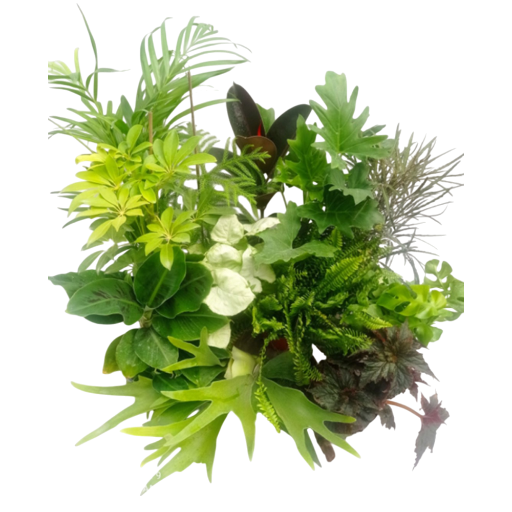 Ez a zöldnövény mix különböző, 15 cm-es cserépben elérhető beltéri növényeket tartalmaz. A „mix” megnevezés azt jelenti, hogy többféle növény közül választhatsz, de minden darabot külön-külön kell megvásárolni. A képen látható példákhoz hasonlóan filodendron, páfrány, kroton, begónia, dracéna és más zöldnövények is előfordulhatnak a kínálatban.